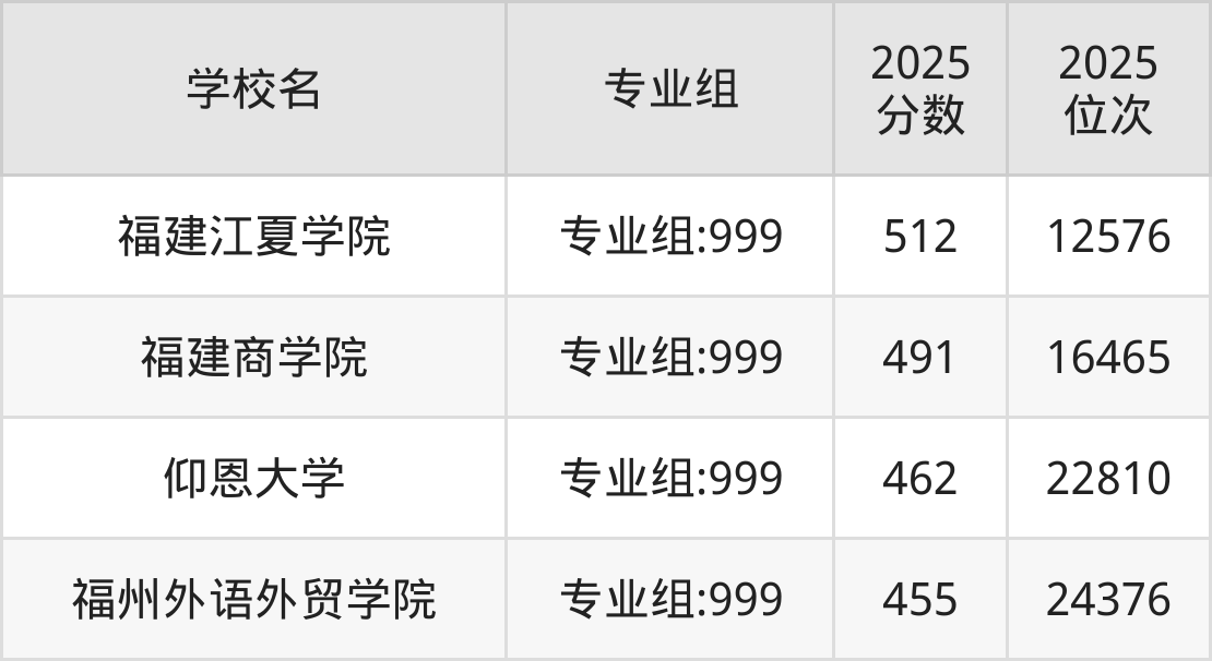 物理类最好考、收分最低的是:福州外语外贸学院,2025年专业组:500最低分441分,最低排名119155名;历史类最好考、收分最低的是:福州外语外贸学院,2025年专业组:999最低分455分,最低排名24376名。