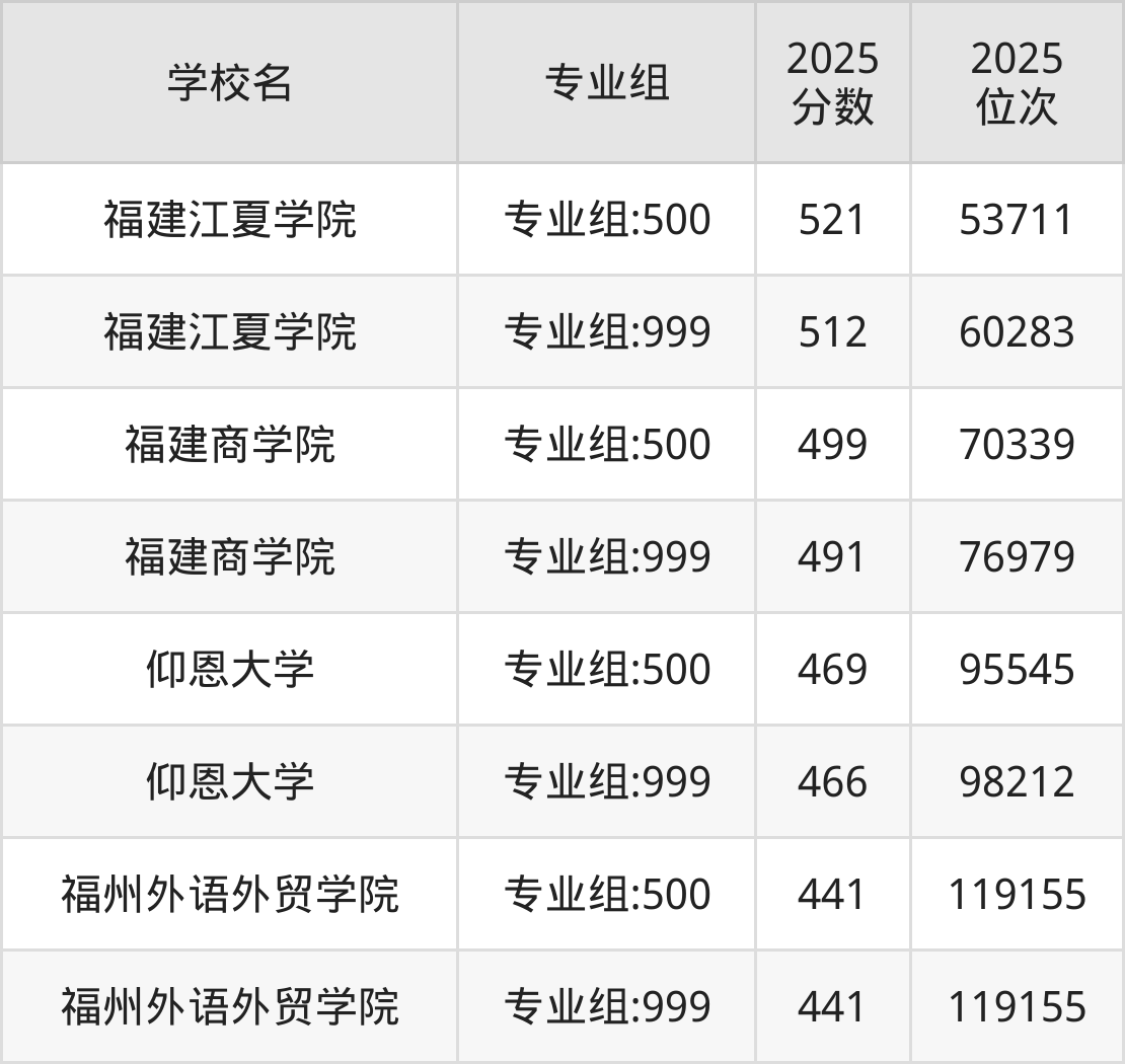 福建省所有二本财经院校2025年录取分数线一览表(前8院校专业组):