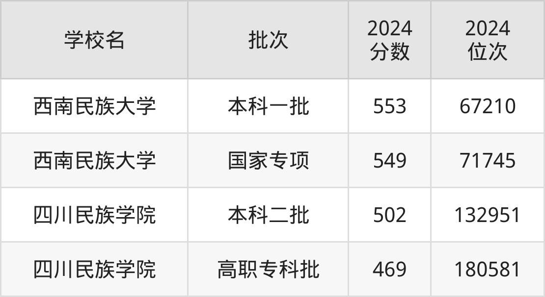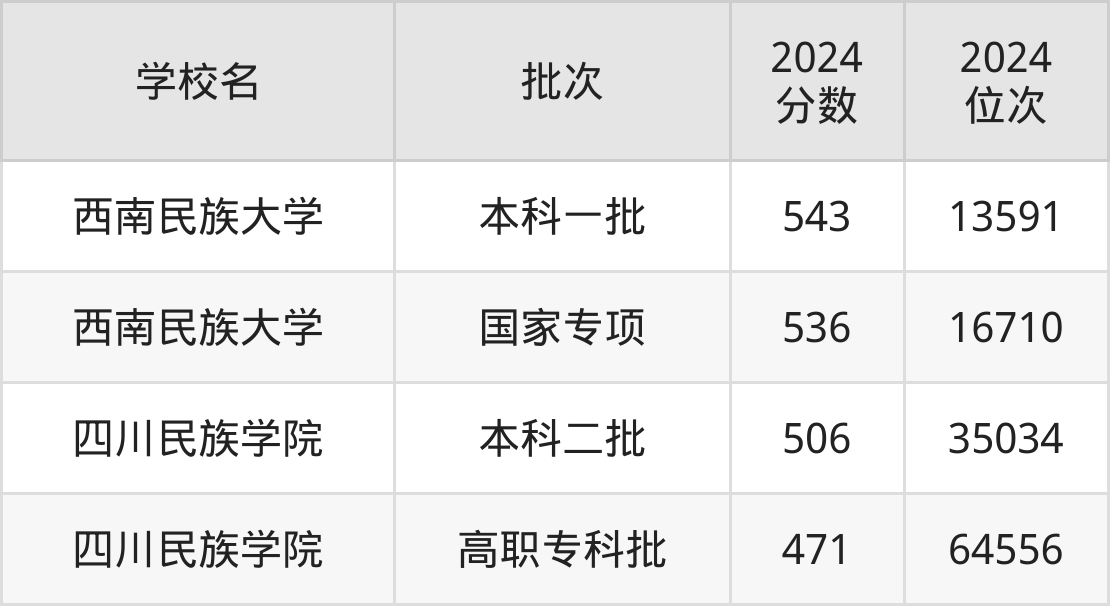 四川省所有二本民族院校2024年录取分数线一览表(前4院校):