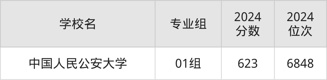 最好考、收分最低的是:中国人民公安大学,2024年01组最低分623分,最低排名6848名。