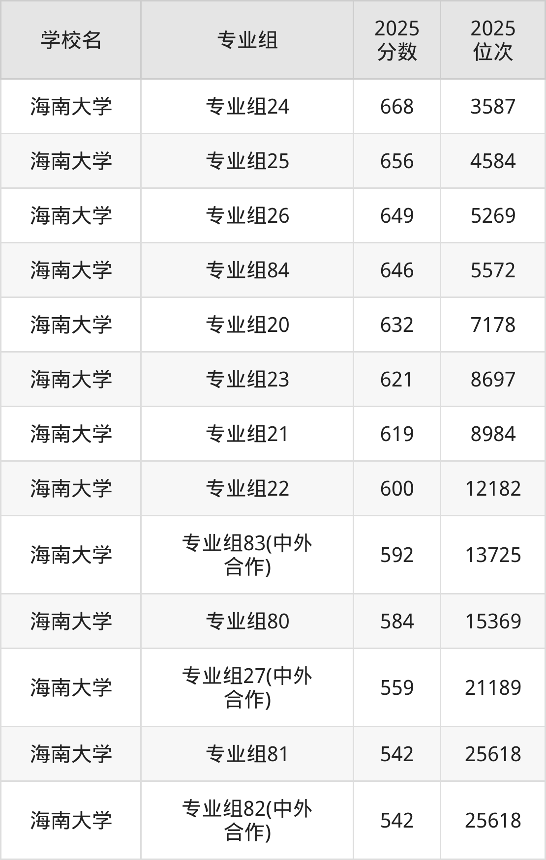 最好考、收分最低的是:海南大学,2025年专业组81最低分542分,最低排名25618名。