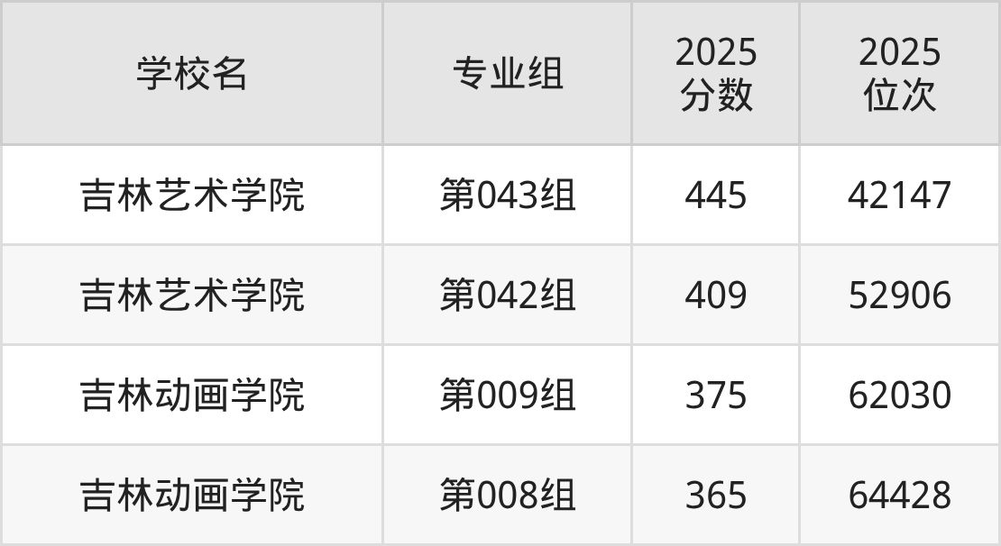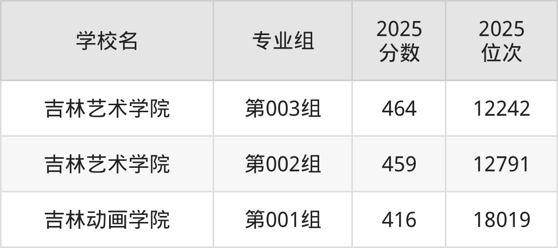 吉林省所有艺术类院校2025年录取分数线一览表: