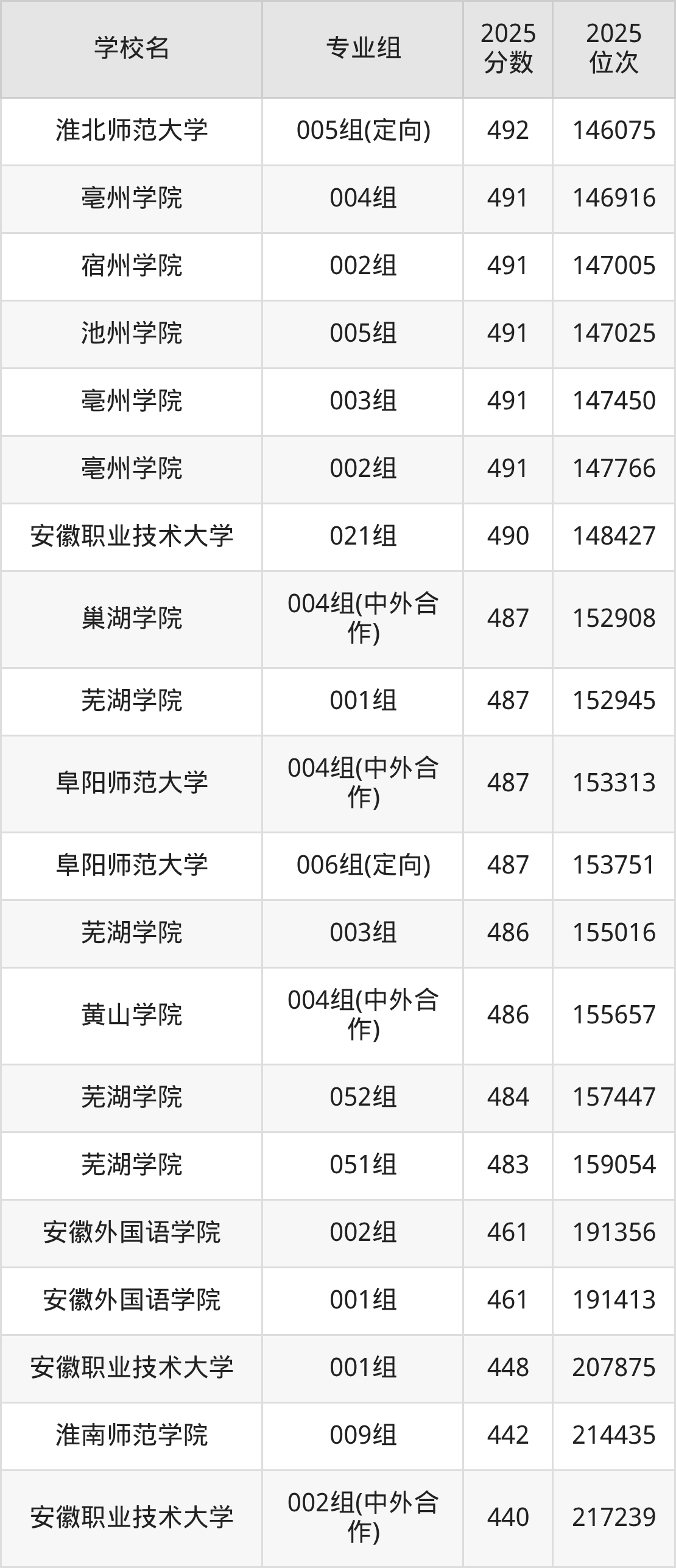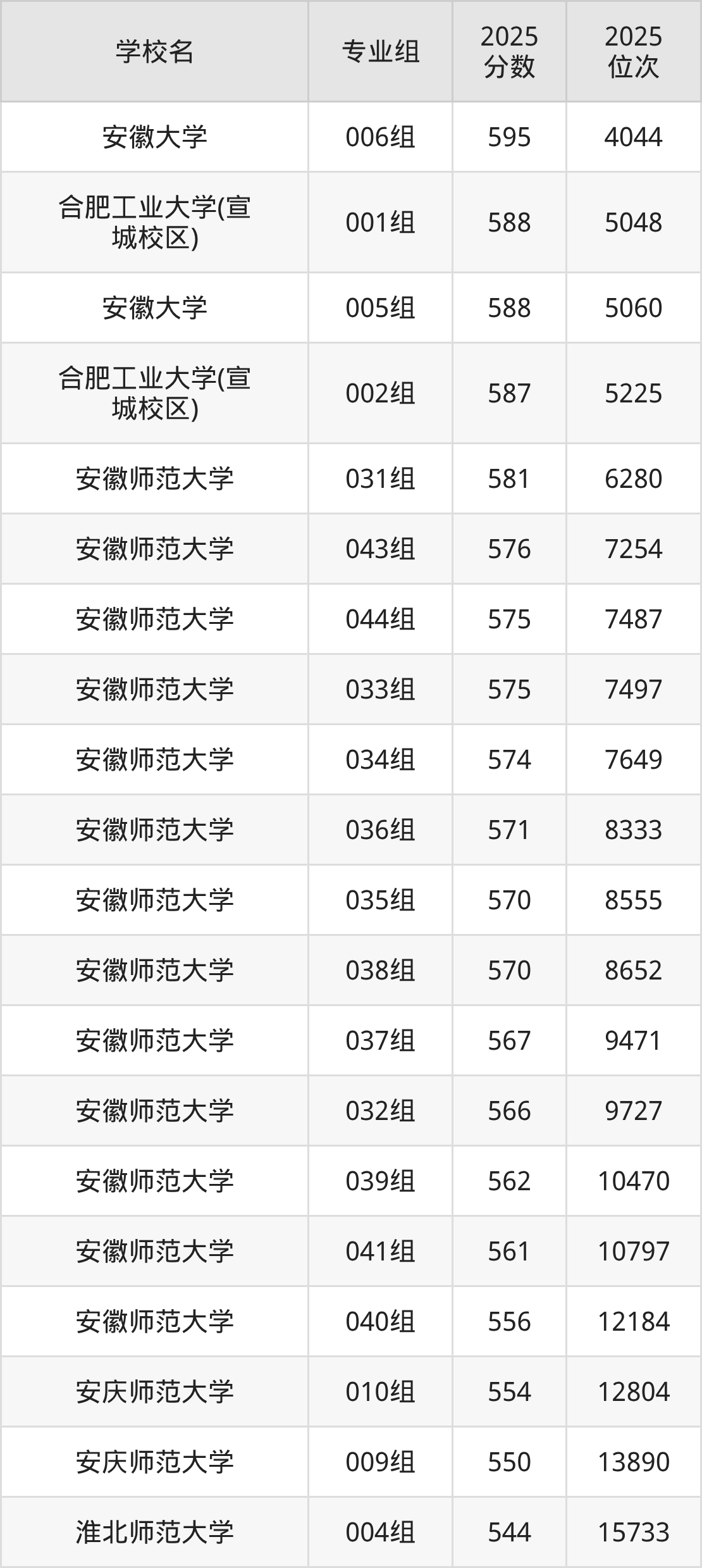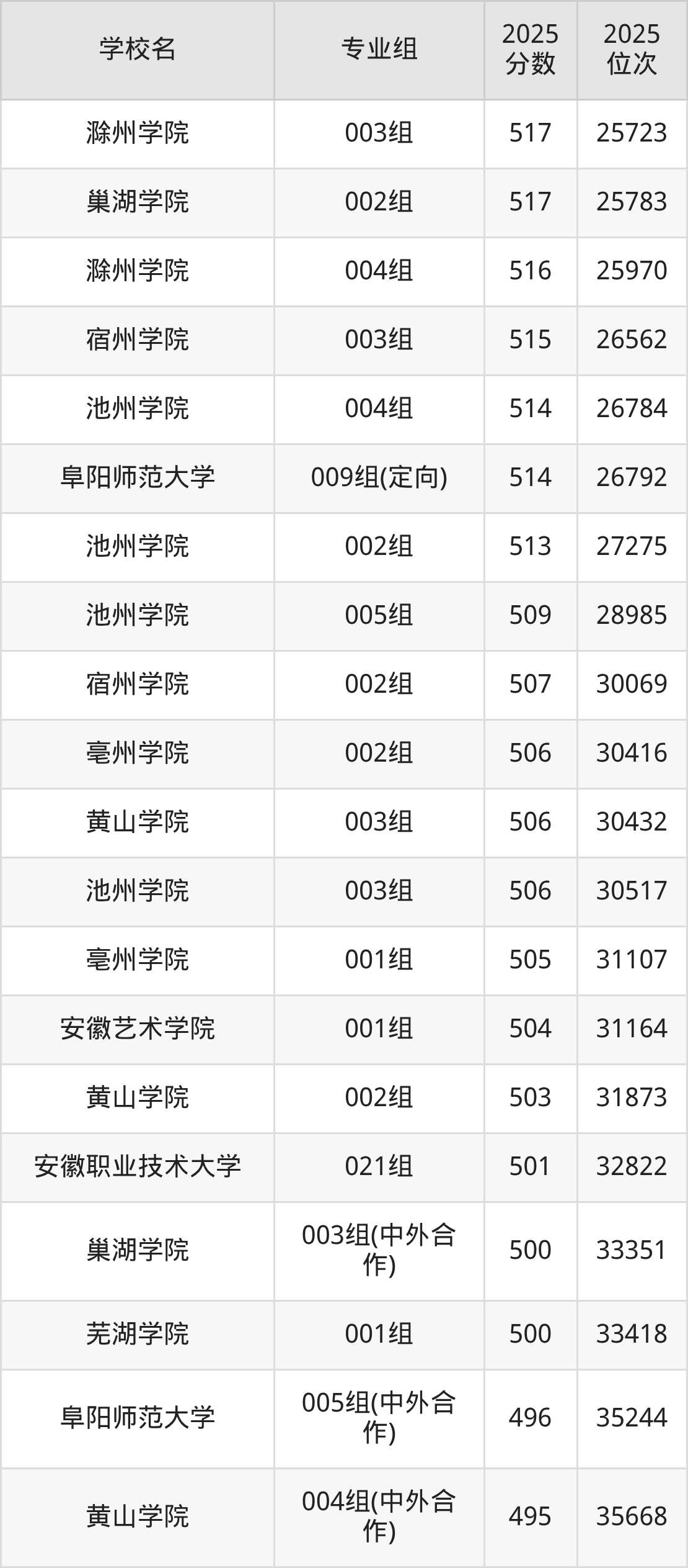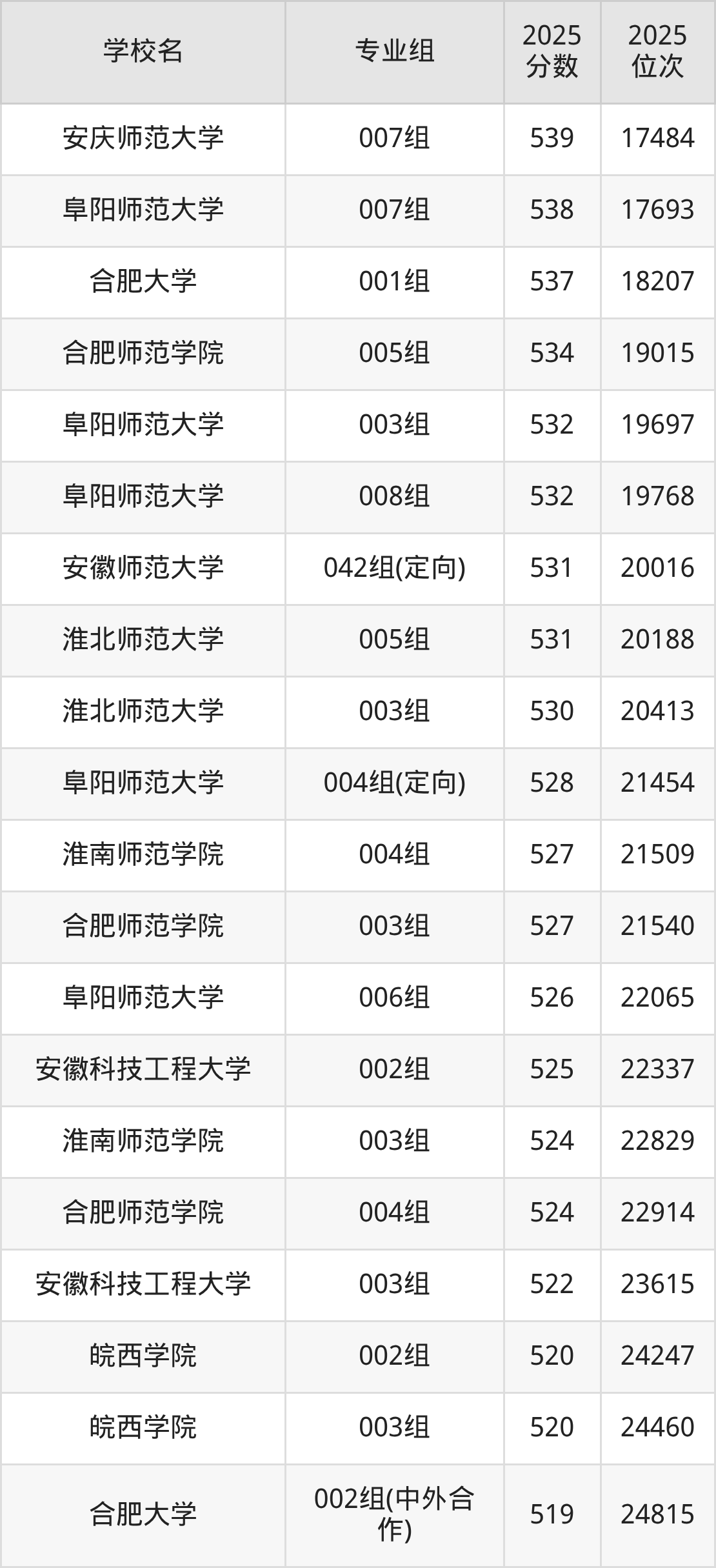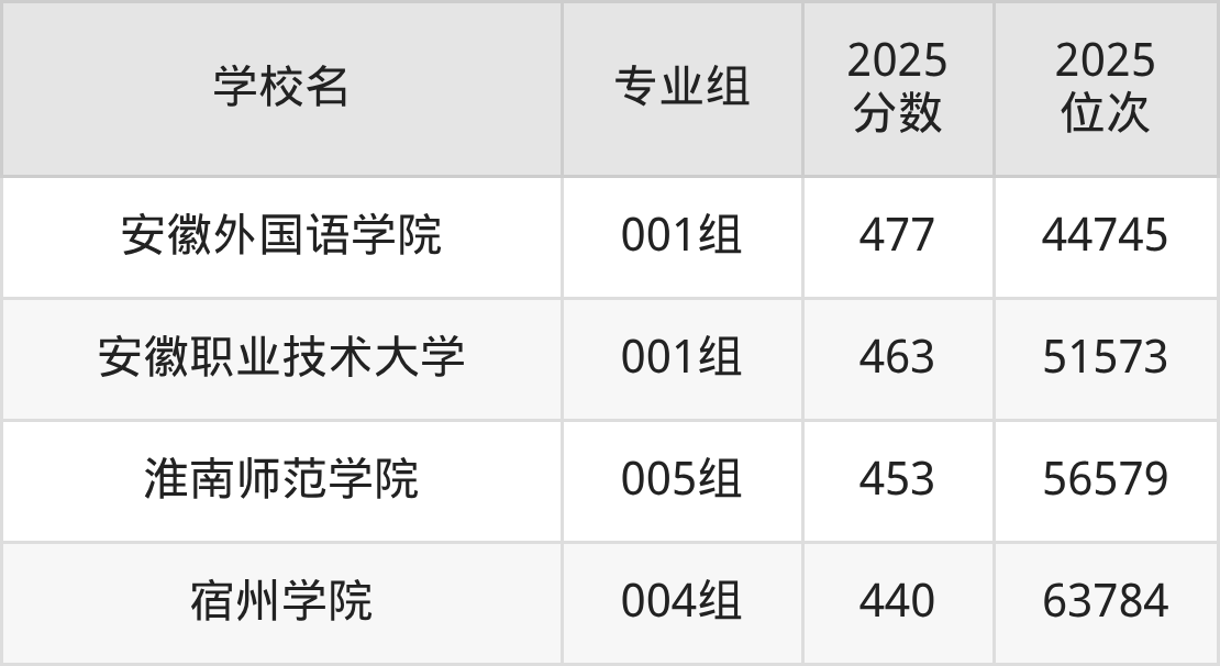 安徽省所有文科院校2025年录取分数线一览表: