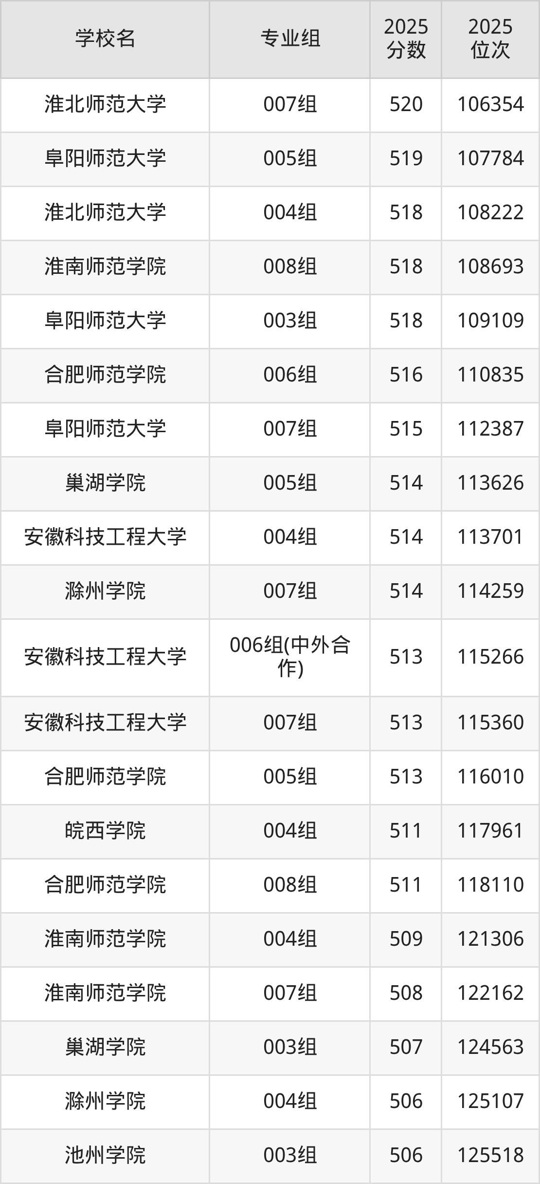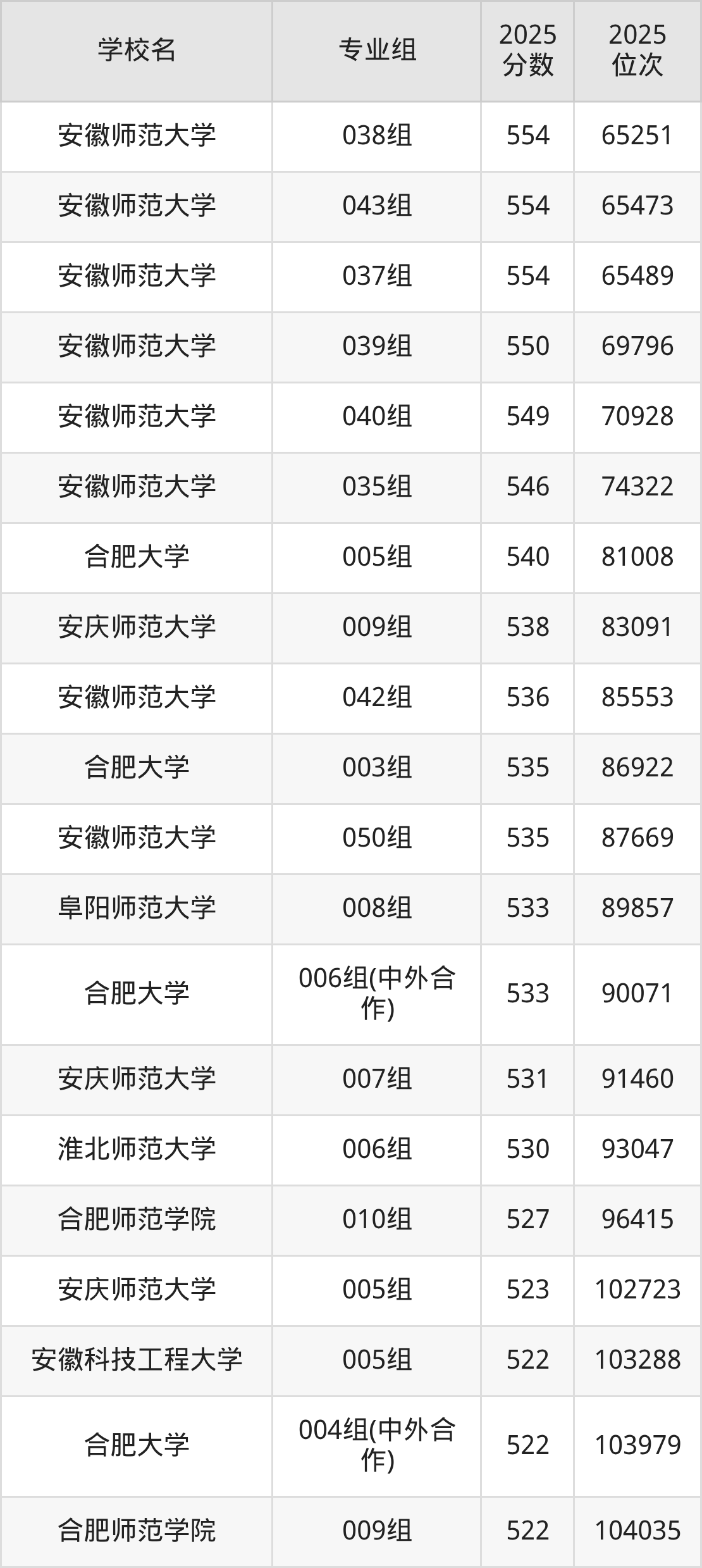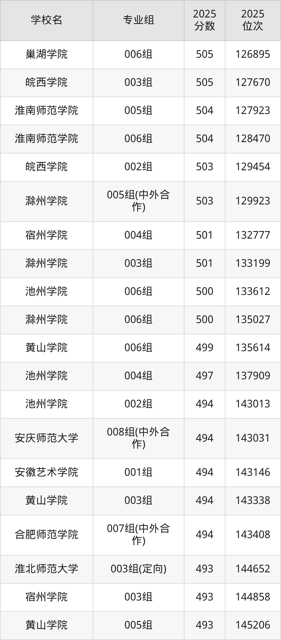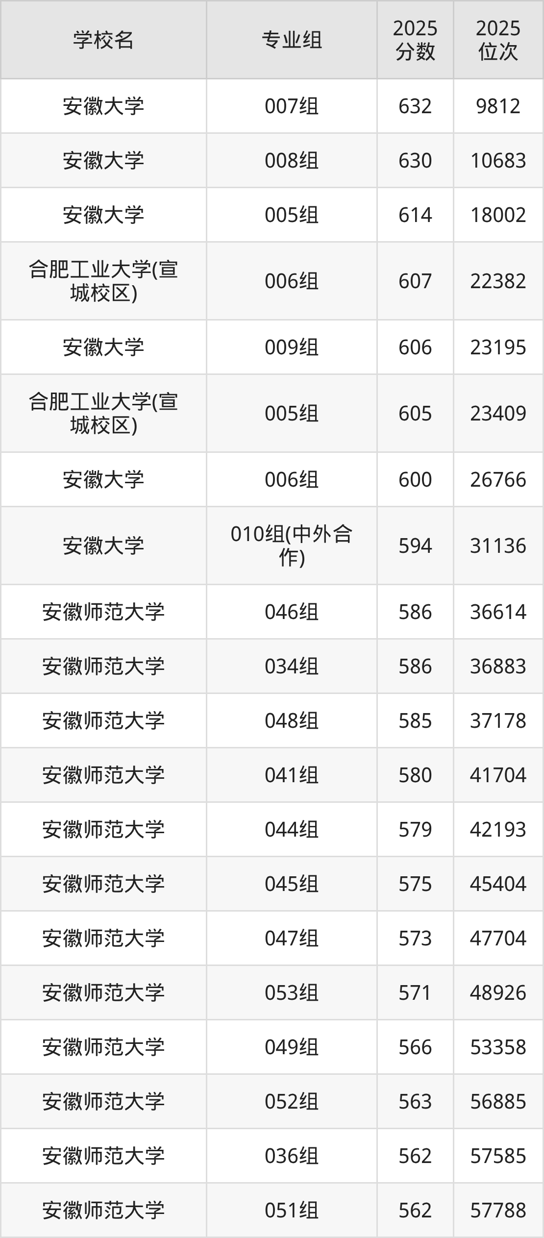 安徽省所有文科院校2025年录取分数线一览表: