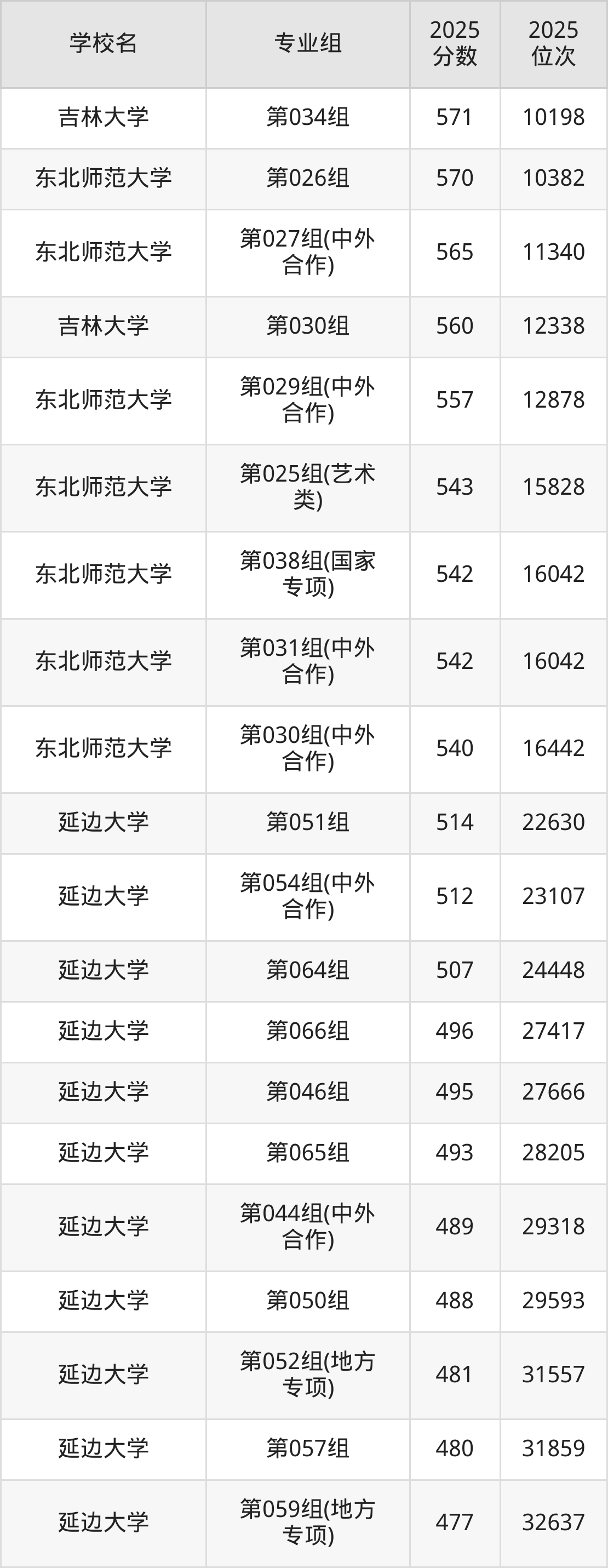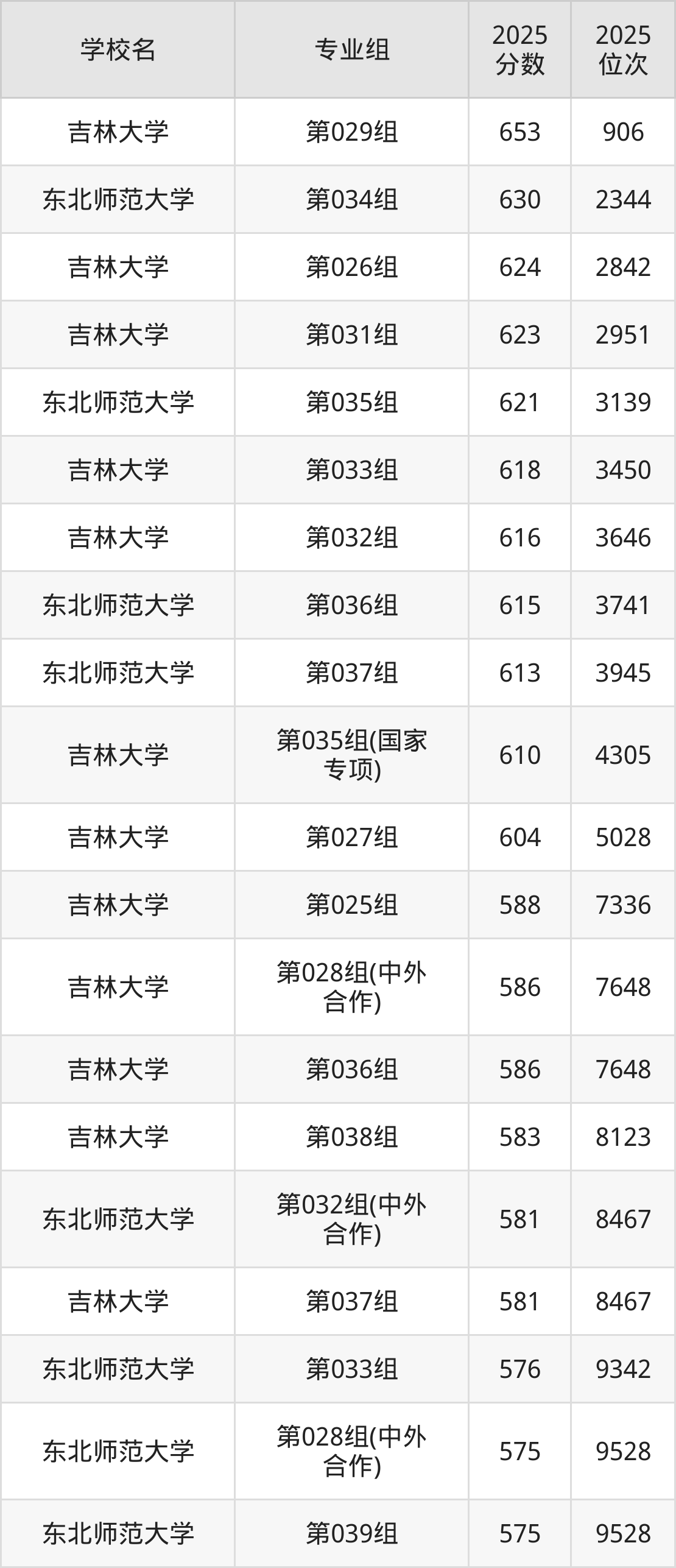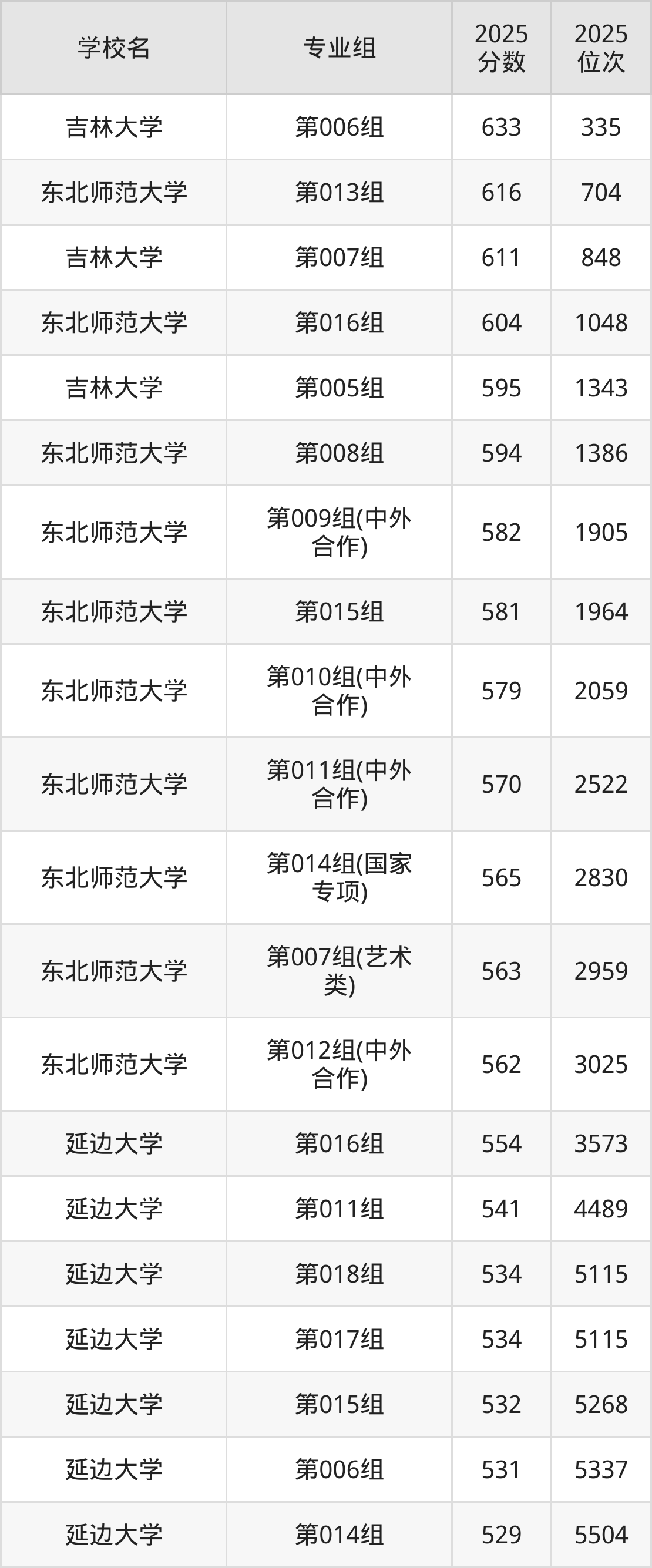 吉林省所有211院校2025年录取分数线一览表(前52院校专业组):