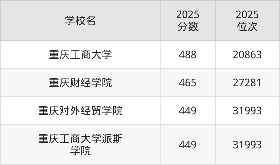 按照2025年重庆市所有财经类院校在市内录取分数线高低排名,为大家整理出了重庆所有财经类院校名单如下。