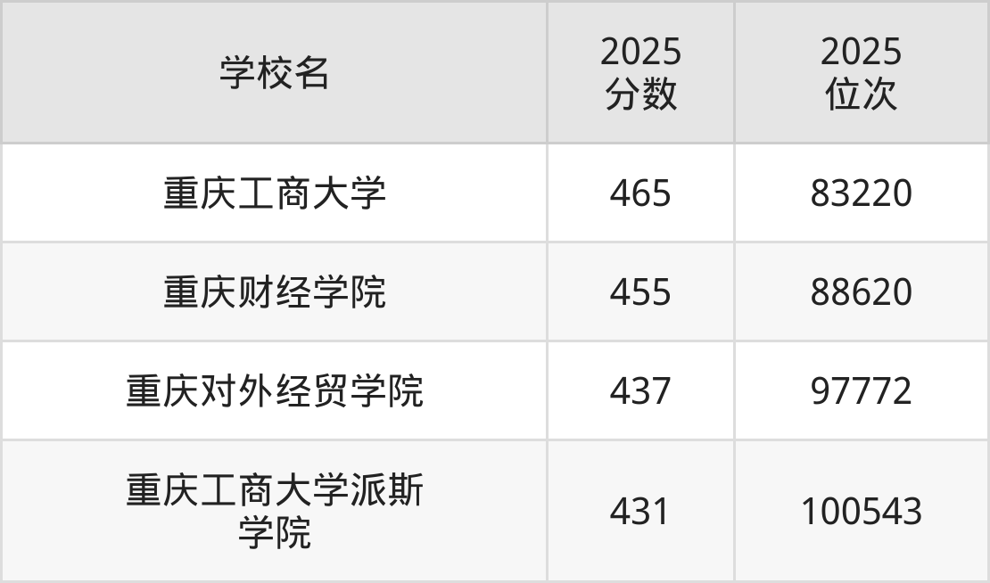 重庆市所有财经类院校2025年录取分数线一览表(前4院校):