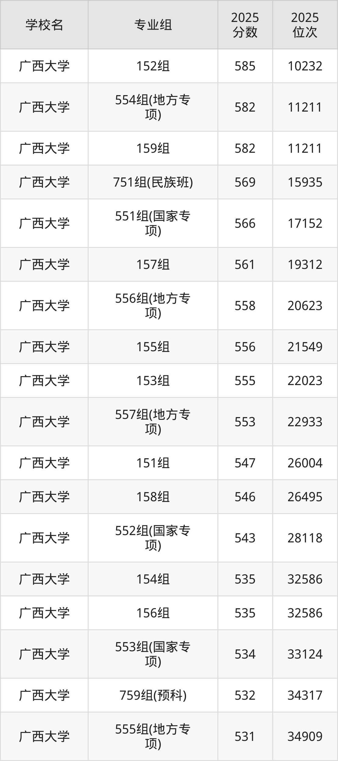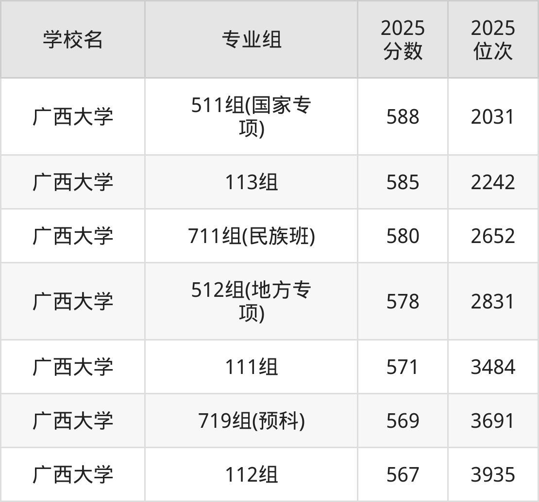物理类最好考、收分最低的是:广西大学,2025年555组(地方专项)最低分531分,最低排名34909名;历史类最好考、收分最低的是:广西大学,2025年112组最低分567分,最低排名3935名。