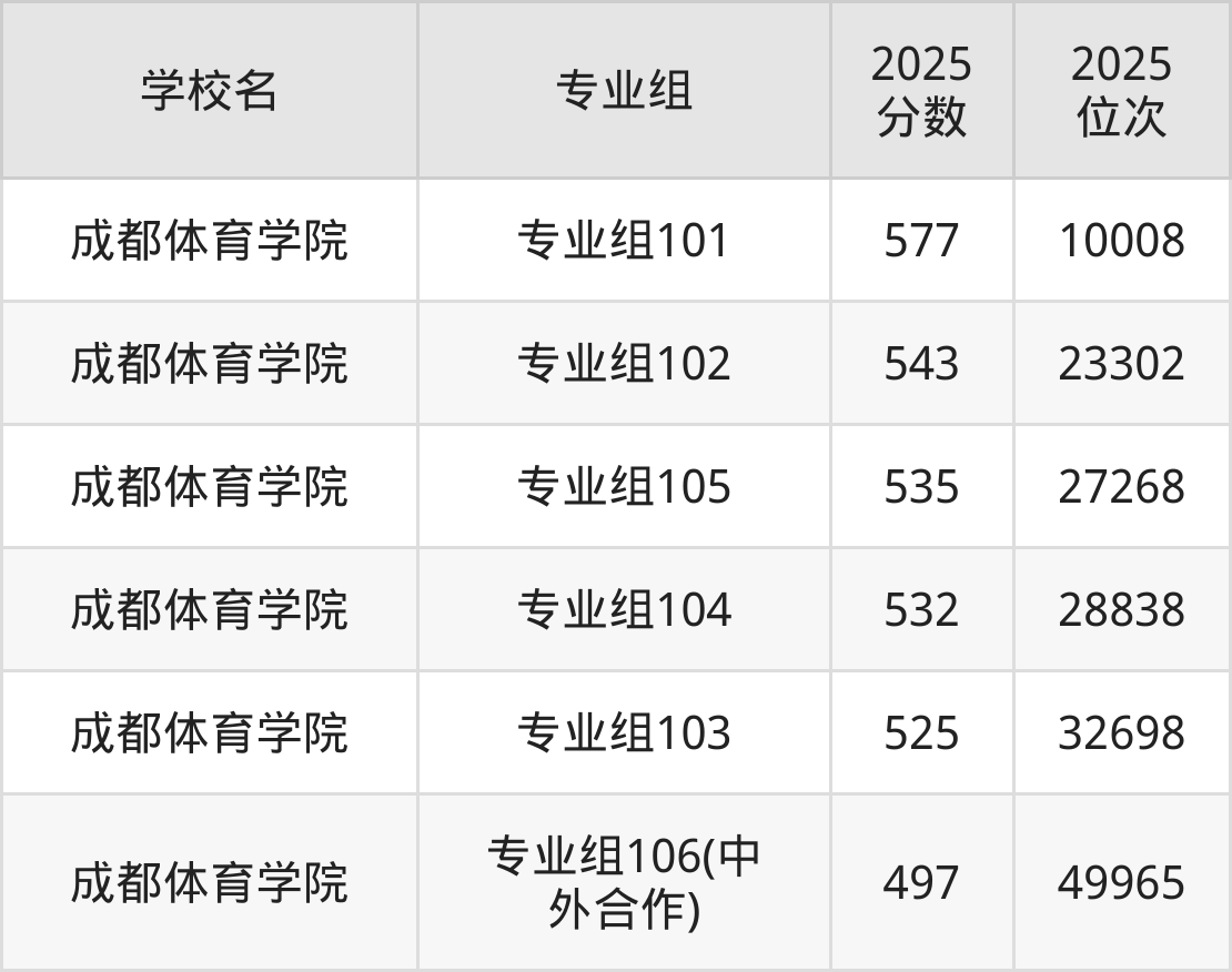 四川省所有体育类院校2025年录取分数线一览表(前7院校专业组):