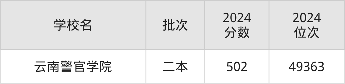 云南省所有公安警察院校2024年录取分数线一览表(前1院校):