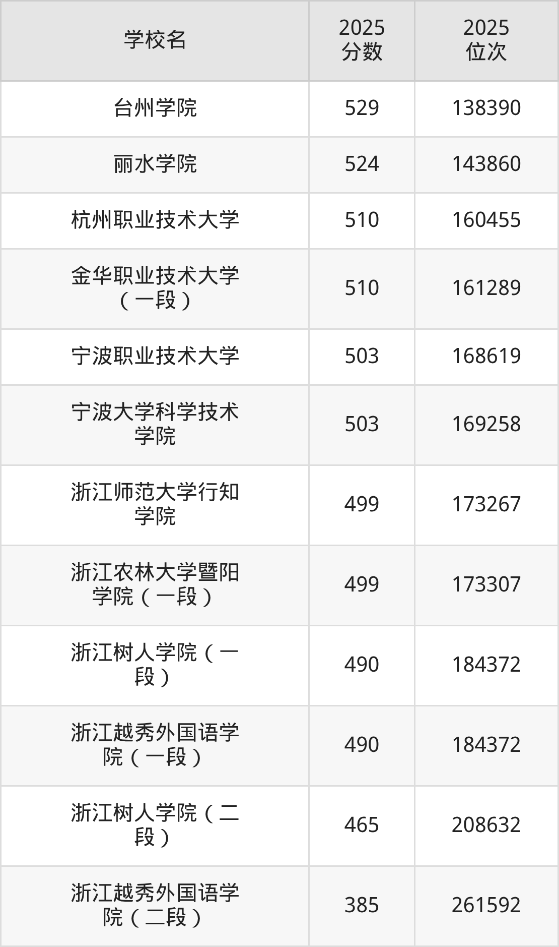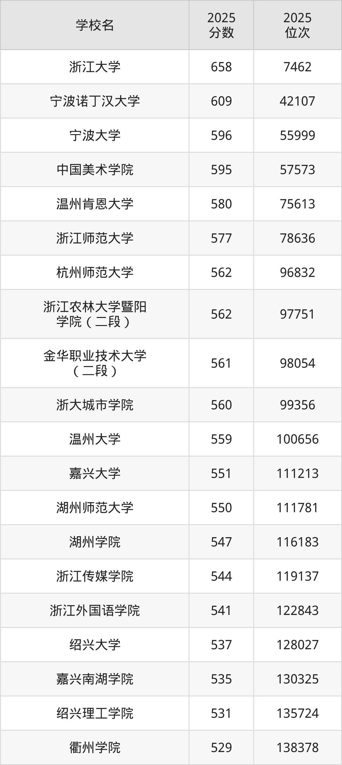 浙江省所有文科院校2025年录取分数线一览表: