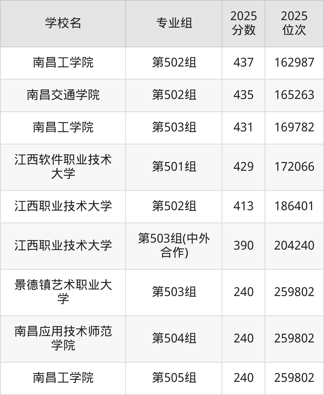 物理类最好考、收分最低的是:景德镇艺术职业大学,2025年第503组最低分240分,最低排名259802名;历史类最好考、收分最低的是:南昌工学院,2025年第105组最低分339分,最低排名148552名。