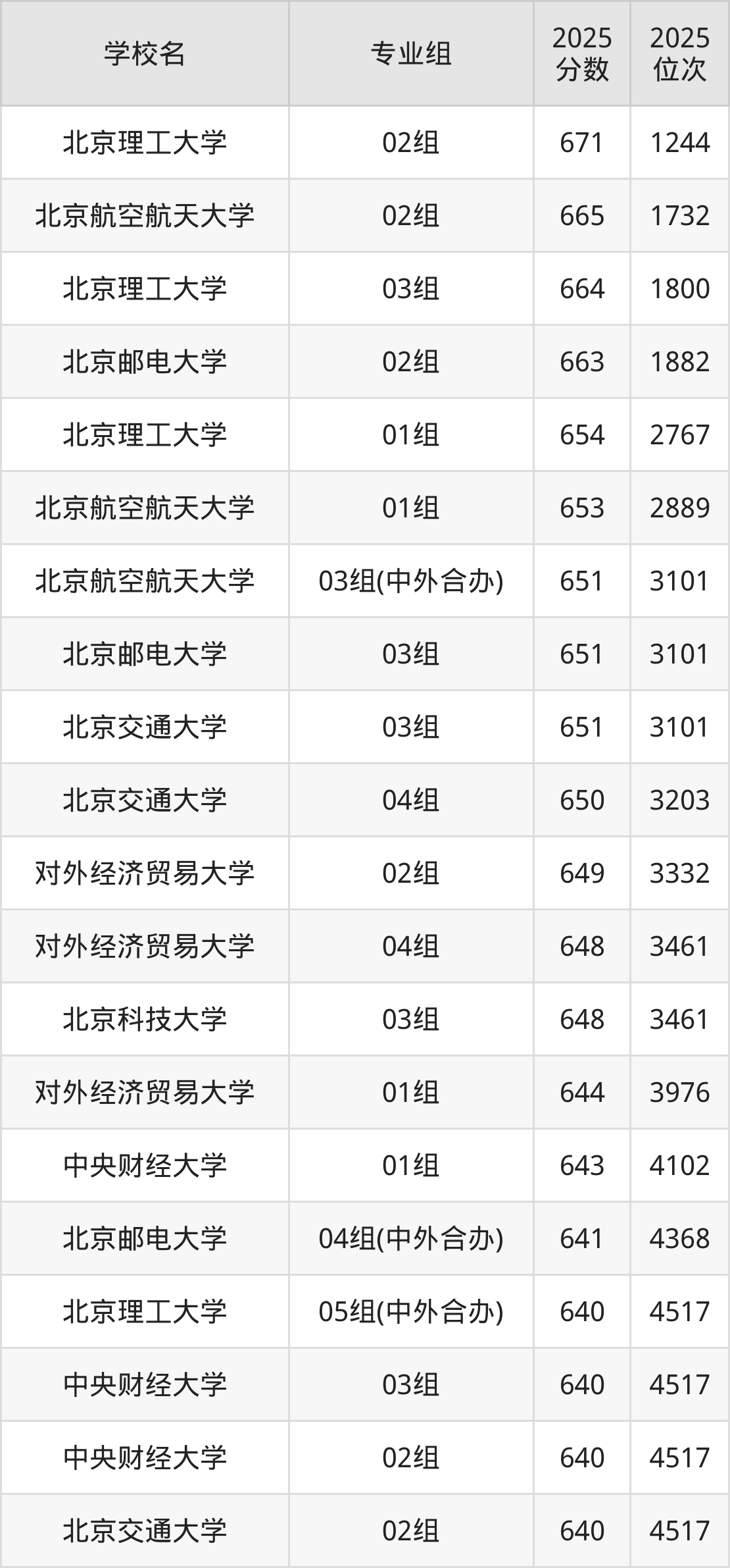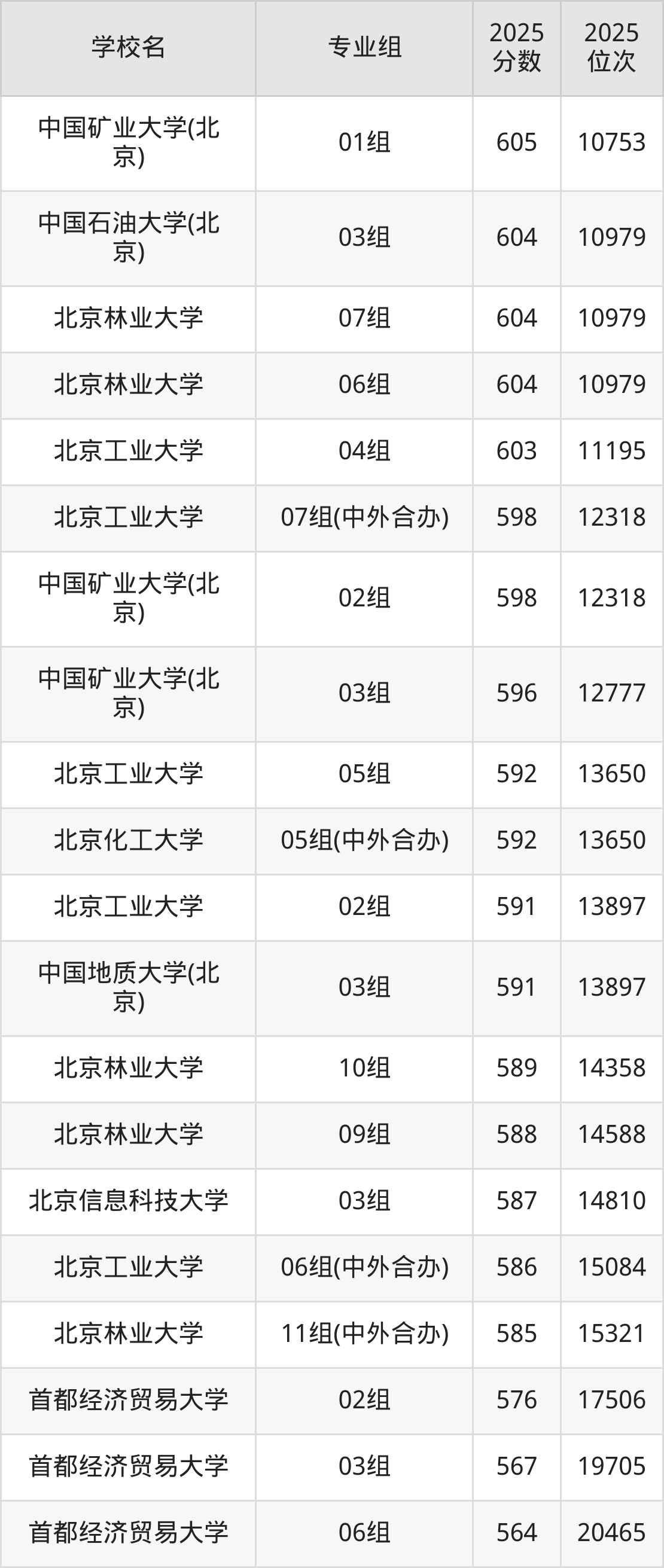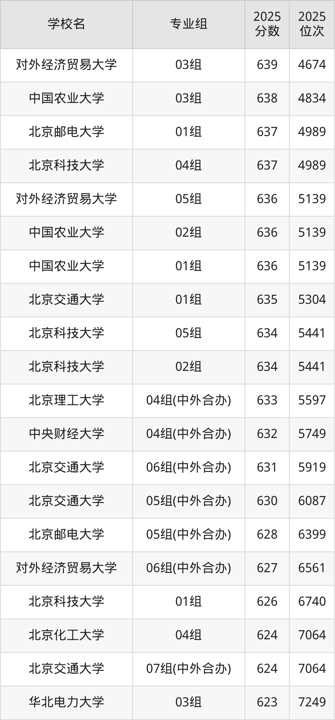 北京市所有理科院校2025年录取分数线一览表(前100院校专业组):