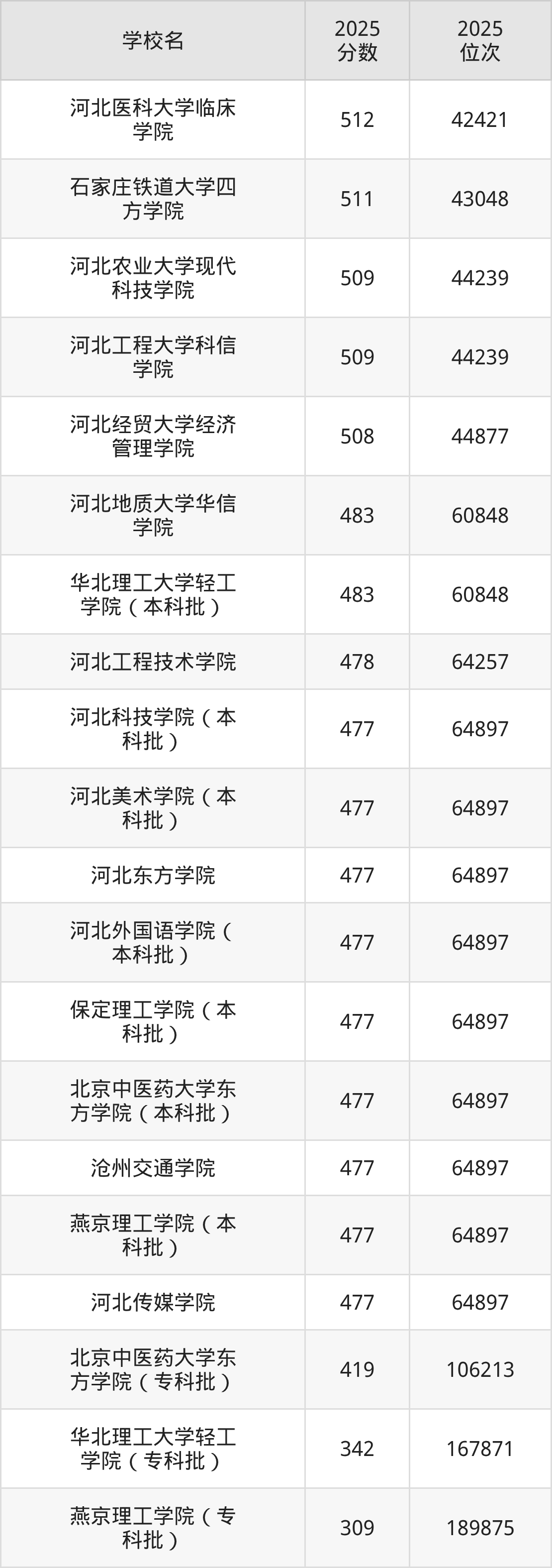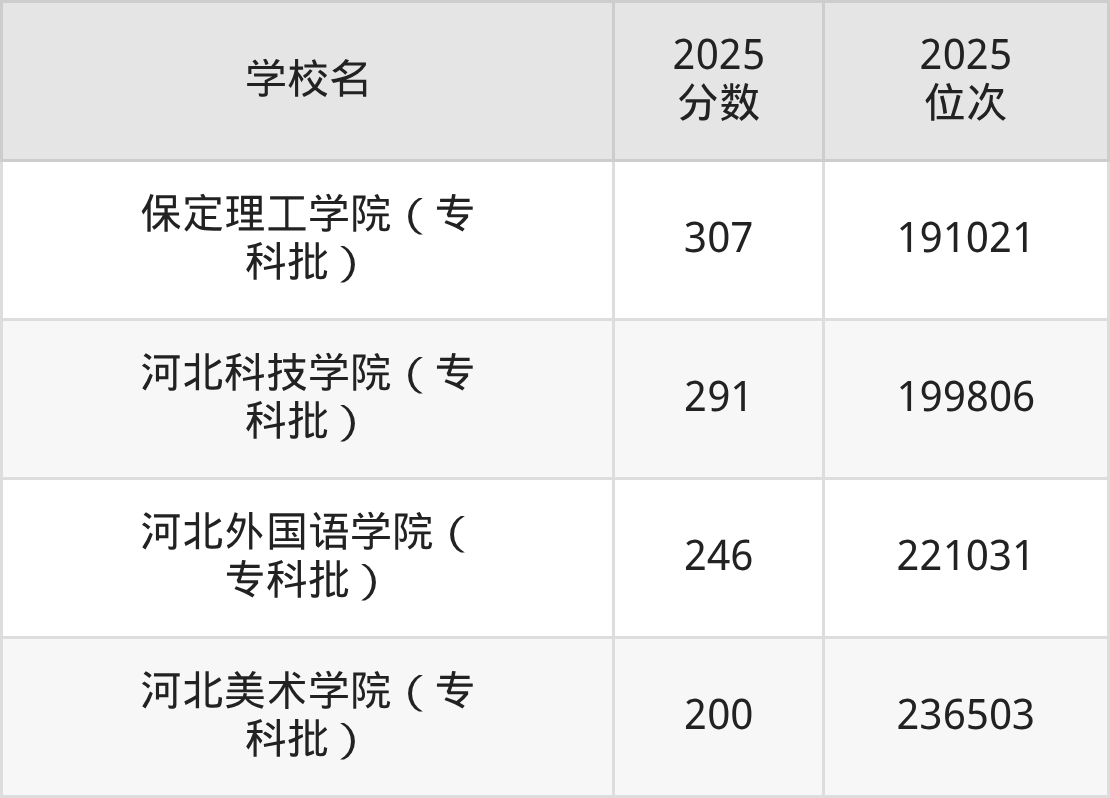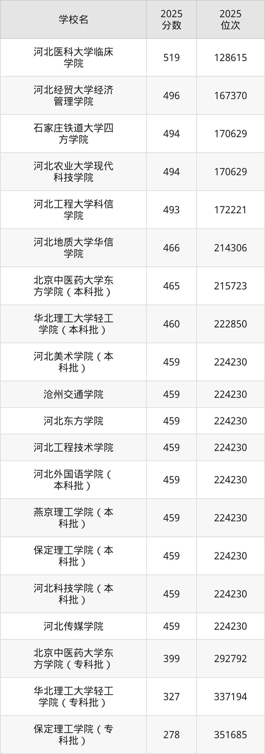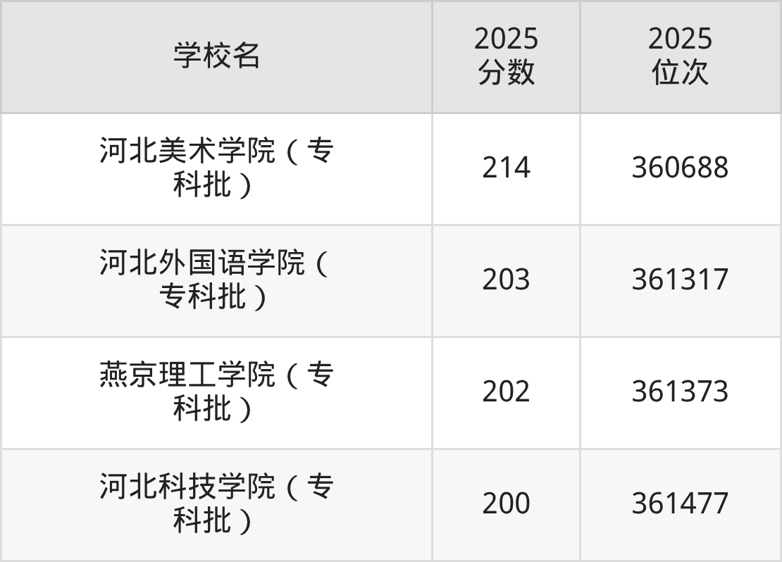 物理类最好考、收分最低的是:河北科技学院,2025年最低分200分,最低排名361477名;历史类最好考、收分最低的是:河北美术学院,2025年最低分200分,最低排名236503名。