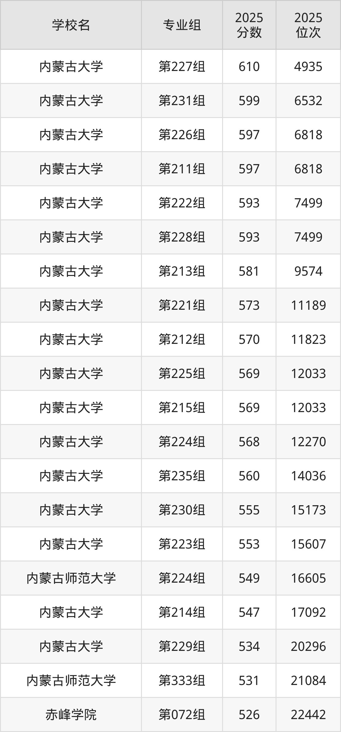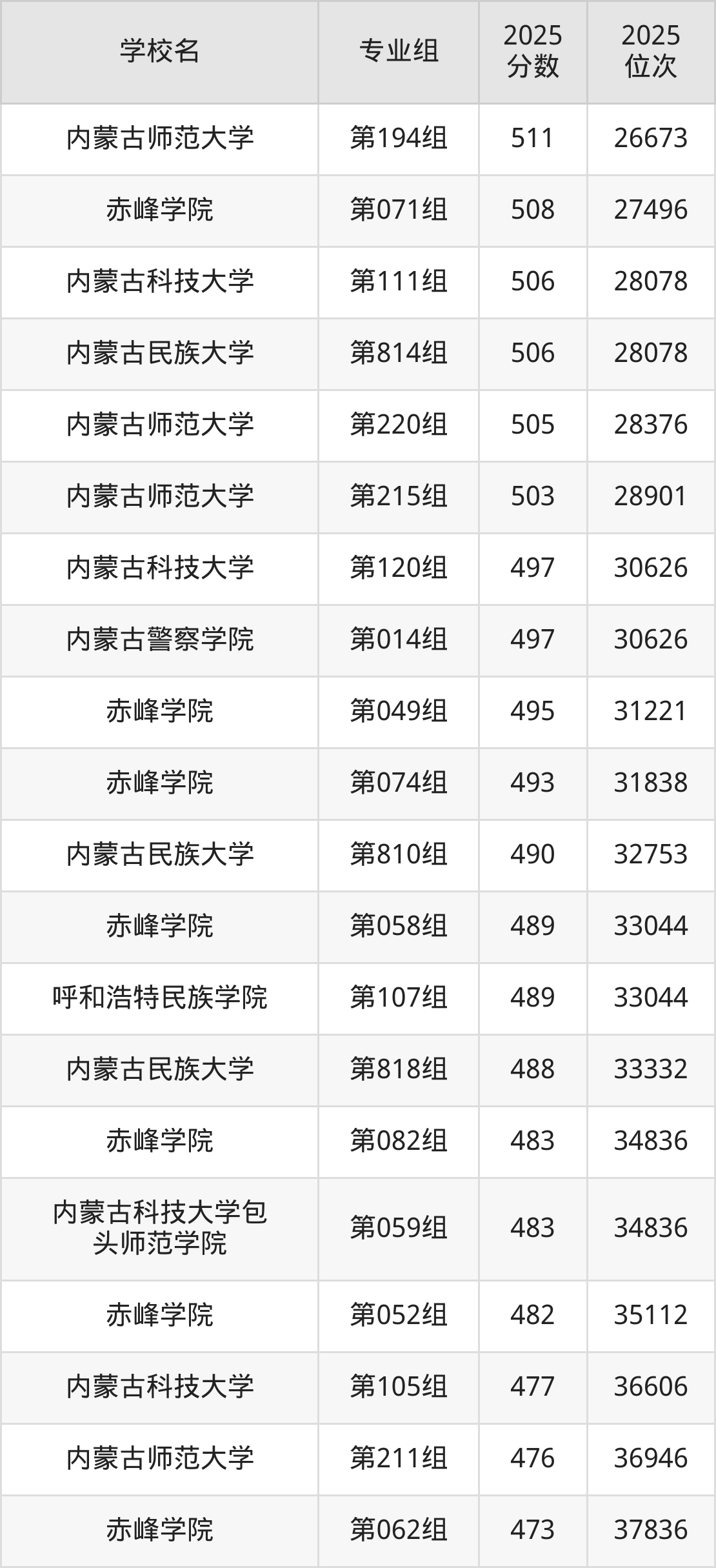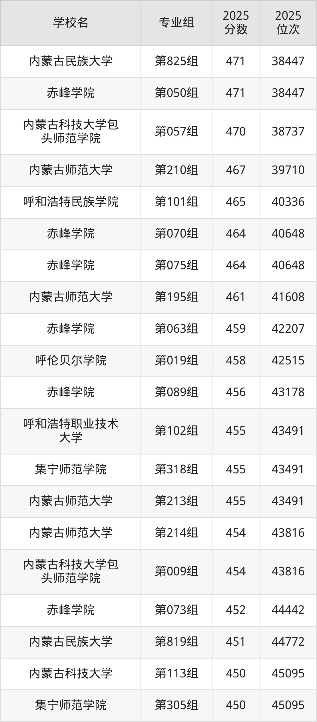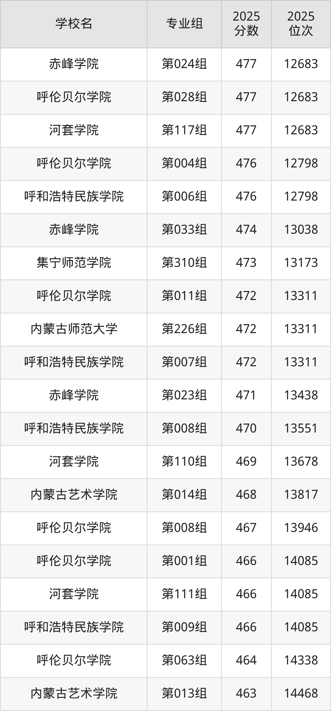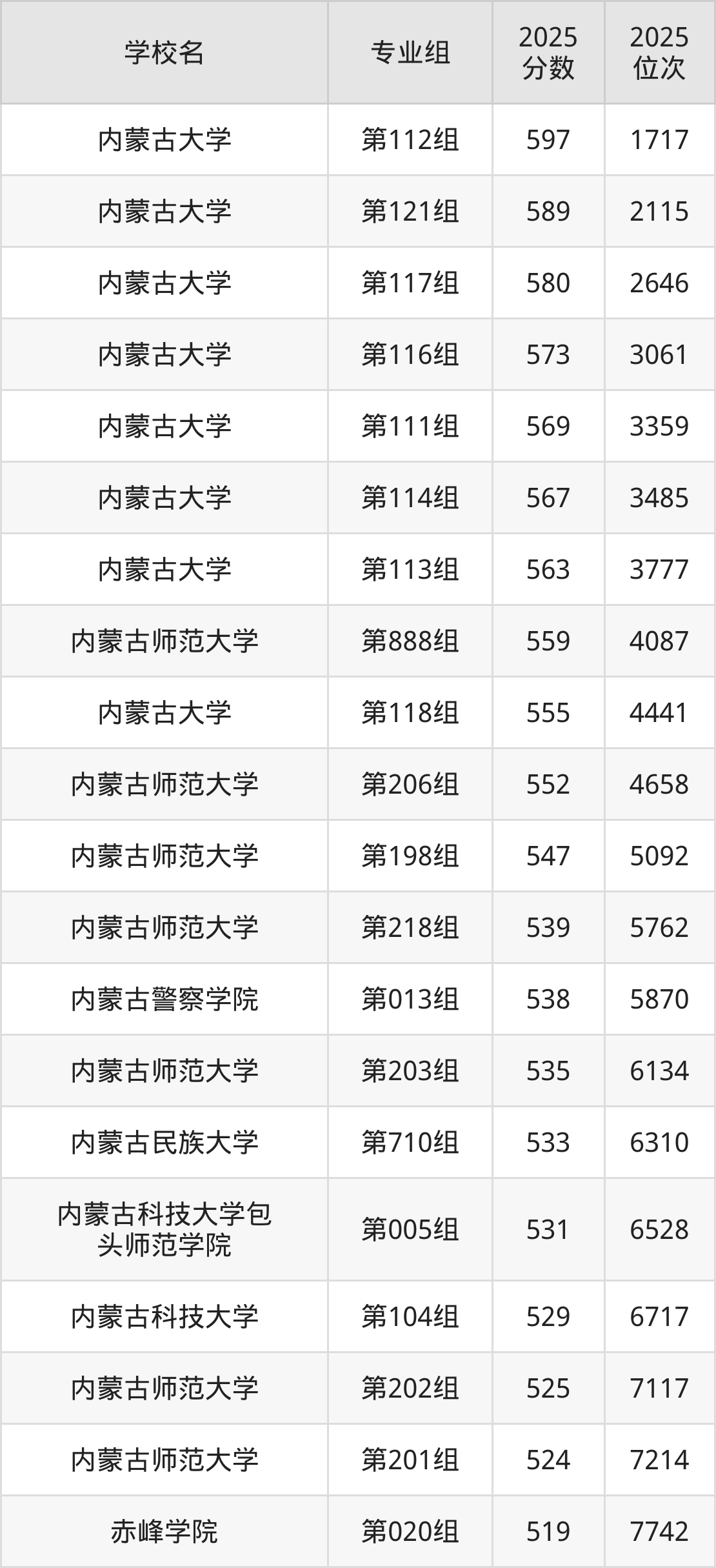 内蒙古自治区所有文科院校2025年录取分数线一览表(前100院校专业组):