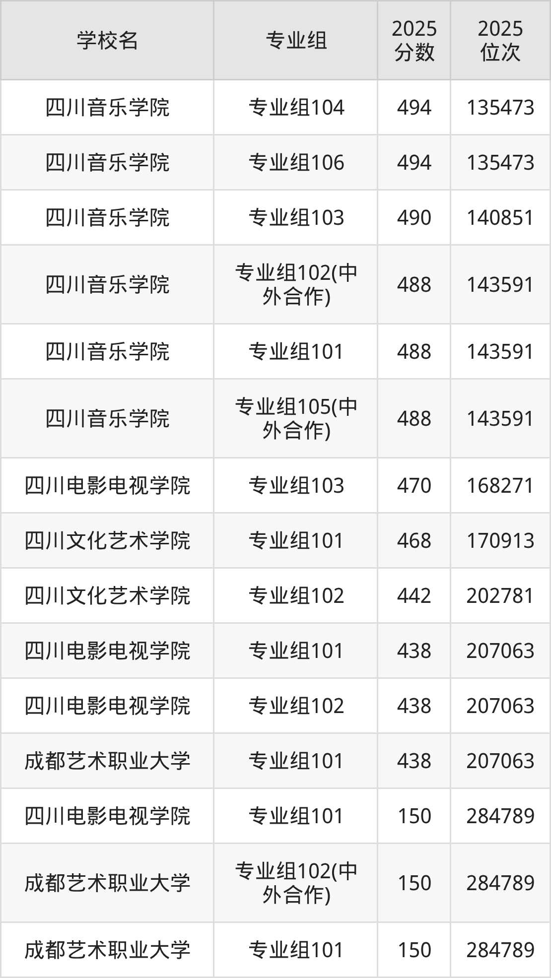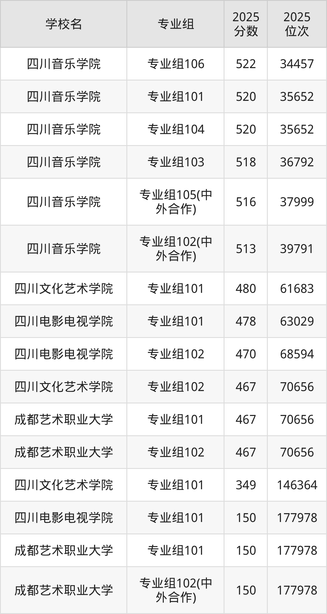 四川省所有艺术类院校2025年录取分数线一览表: