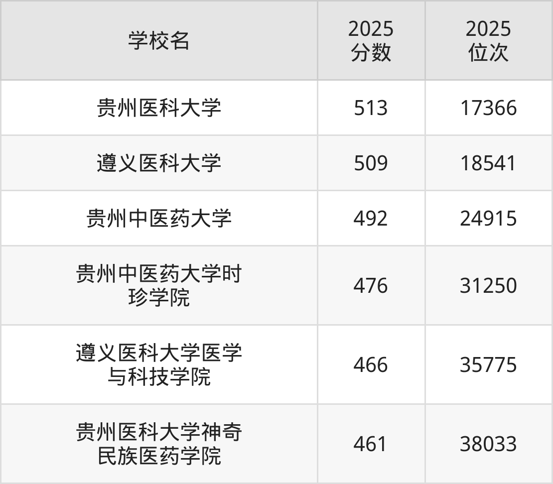 按照2025年贵州省所有医科院校在省内录取分数线高低排名,为大家整理出了贵州所有医科院校名单如下。