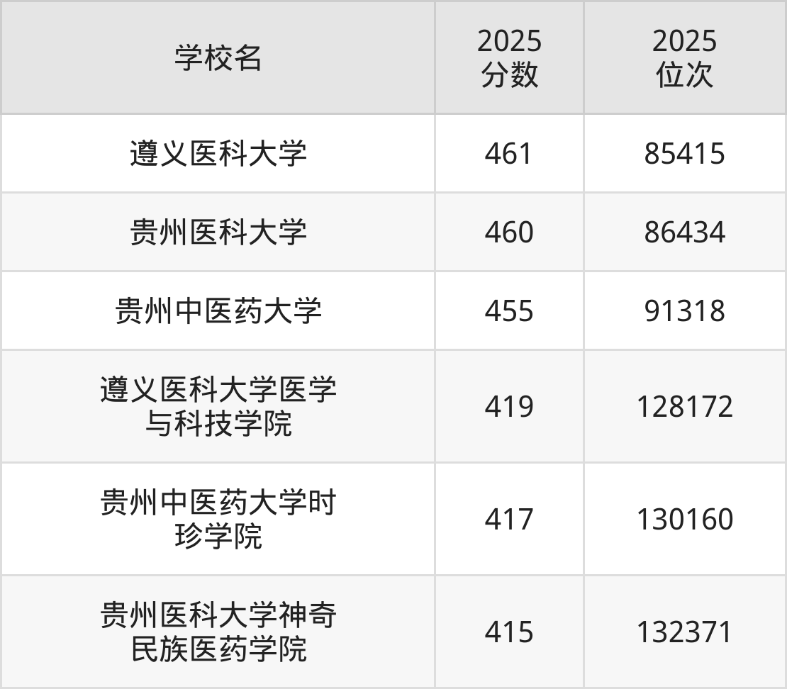 贵州省所有医科院校2025年录取分数线一览表(前6院校):
