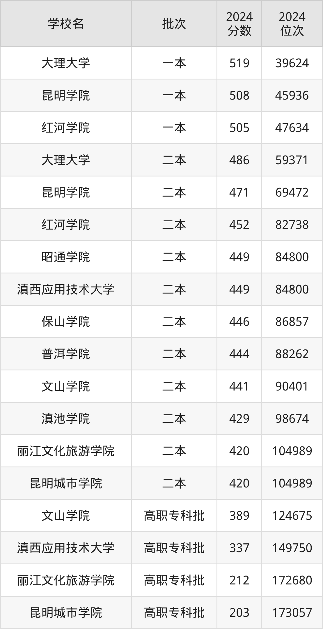 云南省所有二本综合院校2024年录取分数线一览表(前18院校):