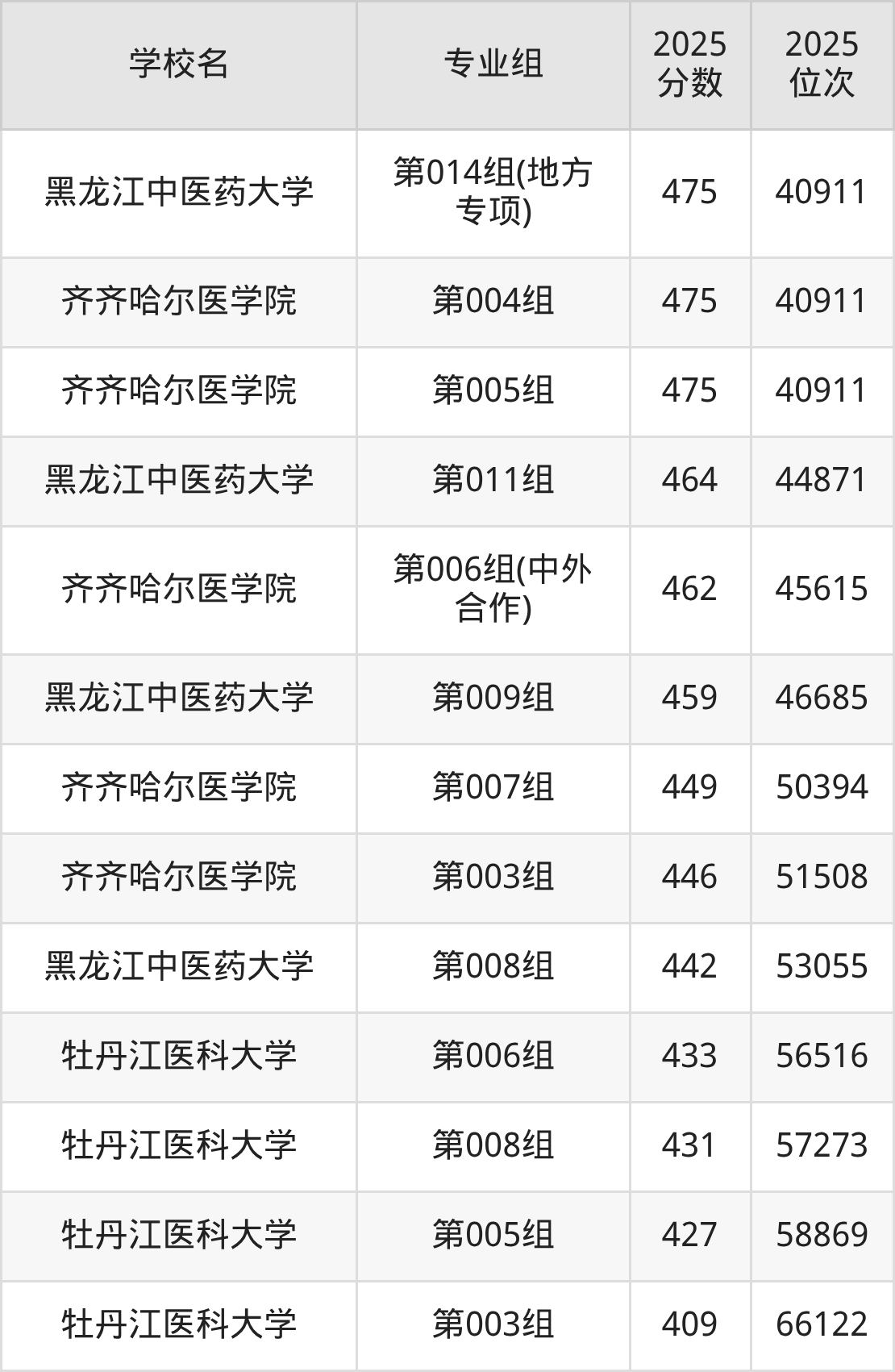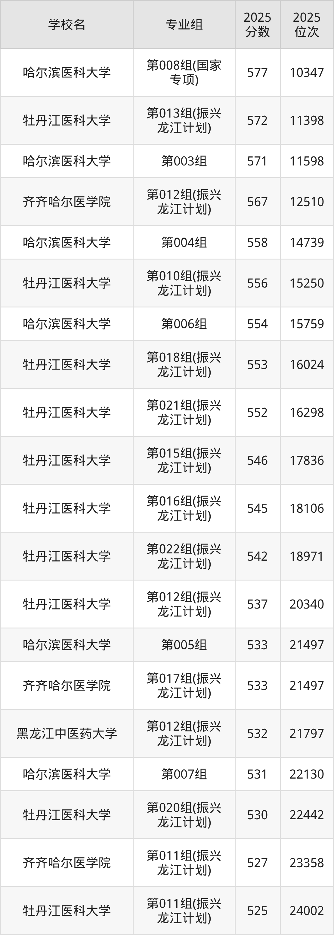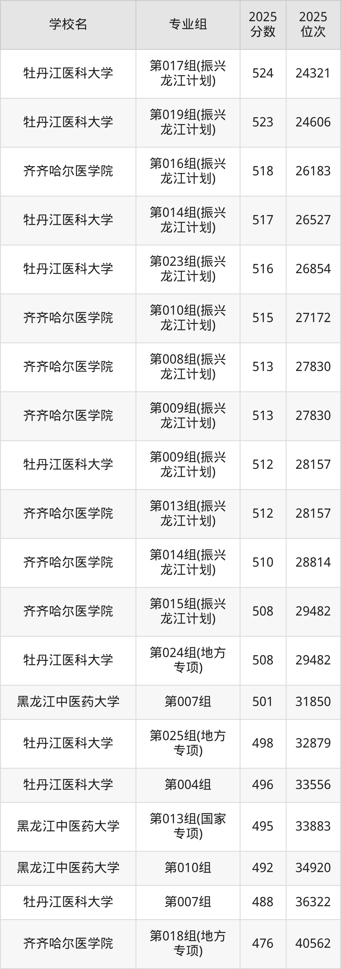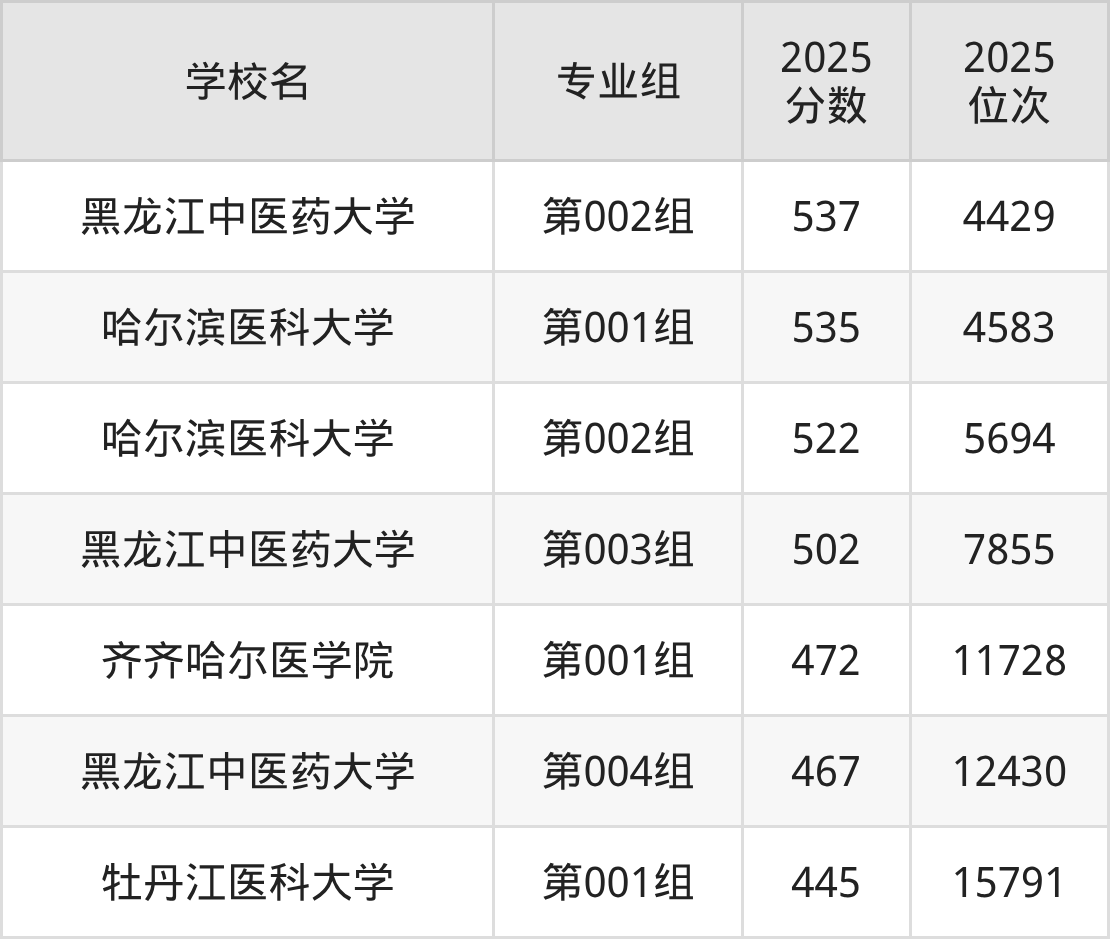 黑龙江省所有医科院校2025年录取分数线一览表: