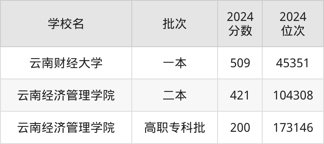 云南省所有二本财经院校2024年录取分数线一览表(前3院校):