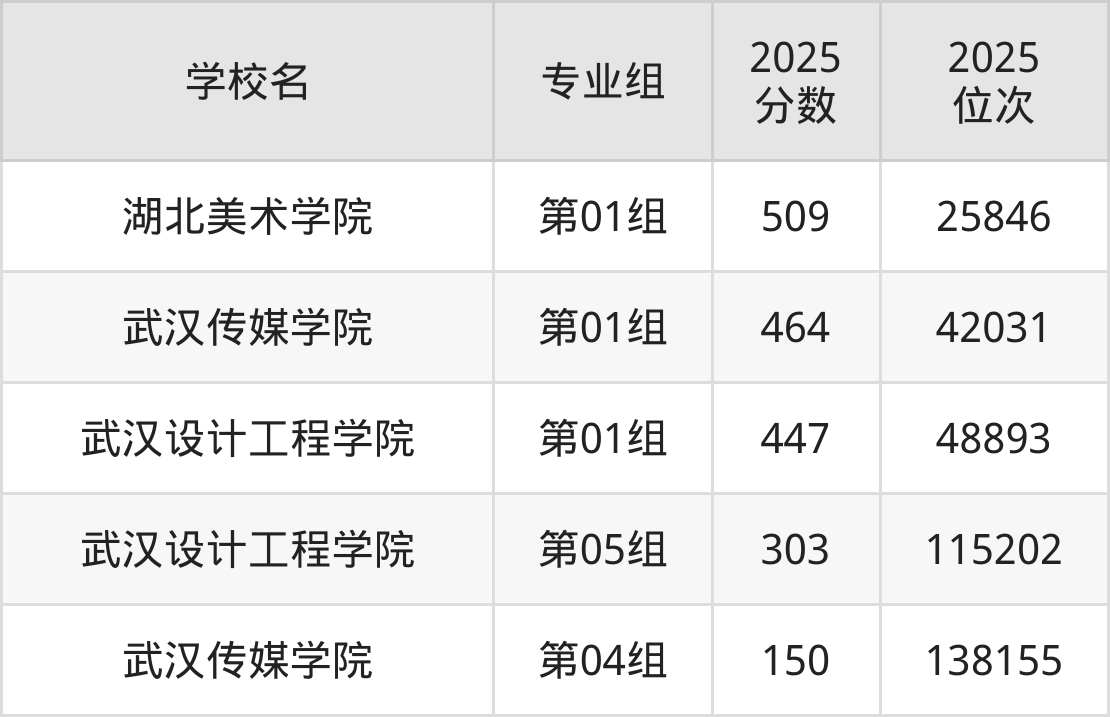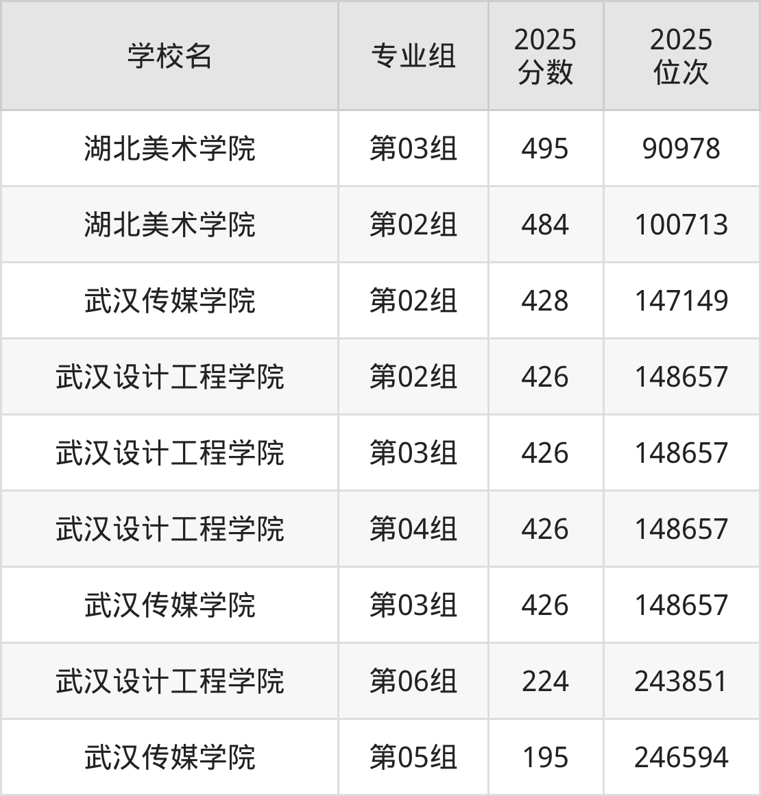 湖北省所有艺术类院校2025年录取分数线一览表(前9院校专业组):