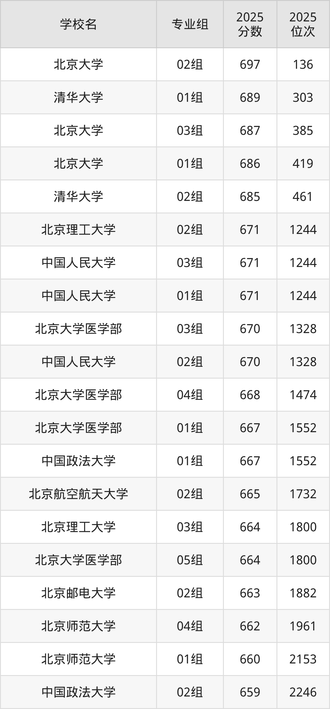 最难考、收分最高的是:北京大学,2025年学校的02组最低分697分,对应排位136名。
