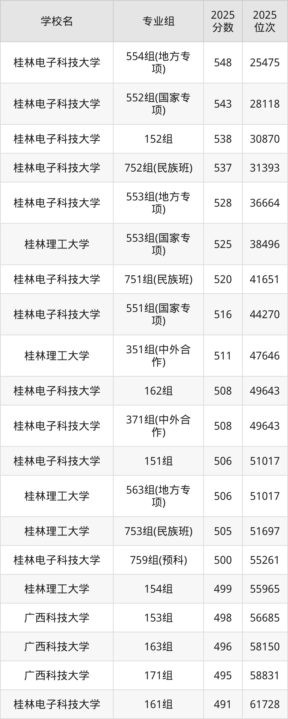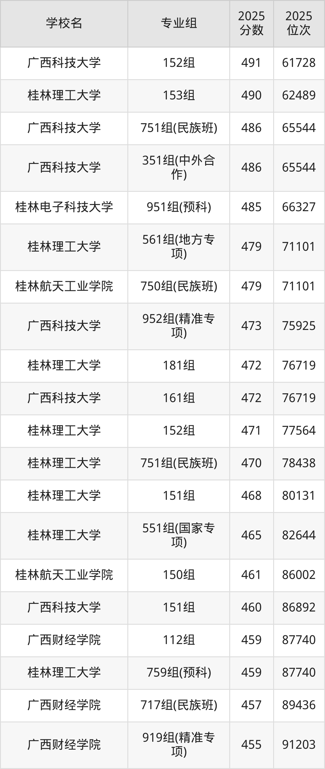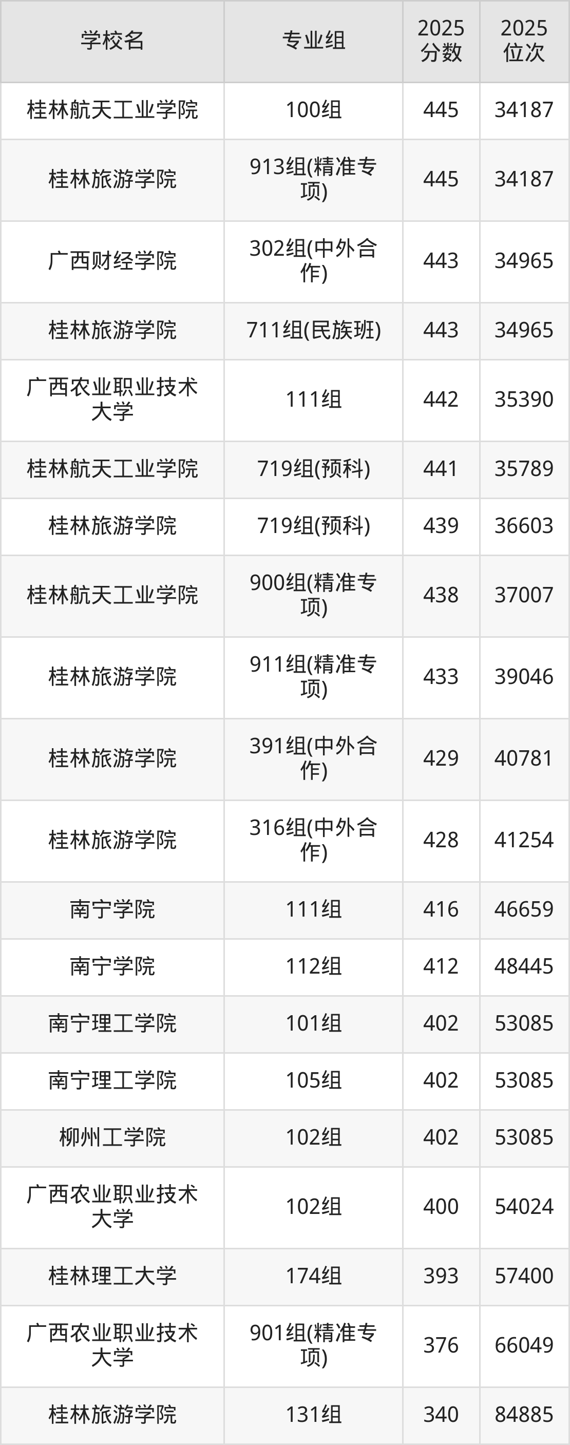 广西壮族自治区所有理科院校2025年录取分数线一览表(前94院校专业组):