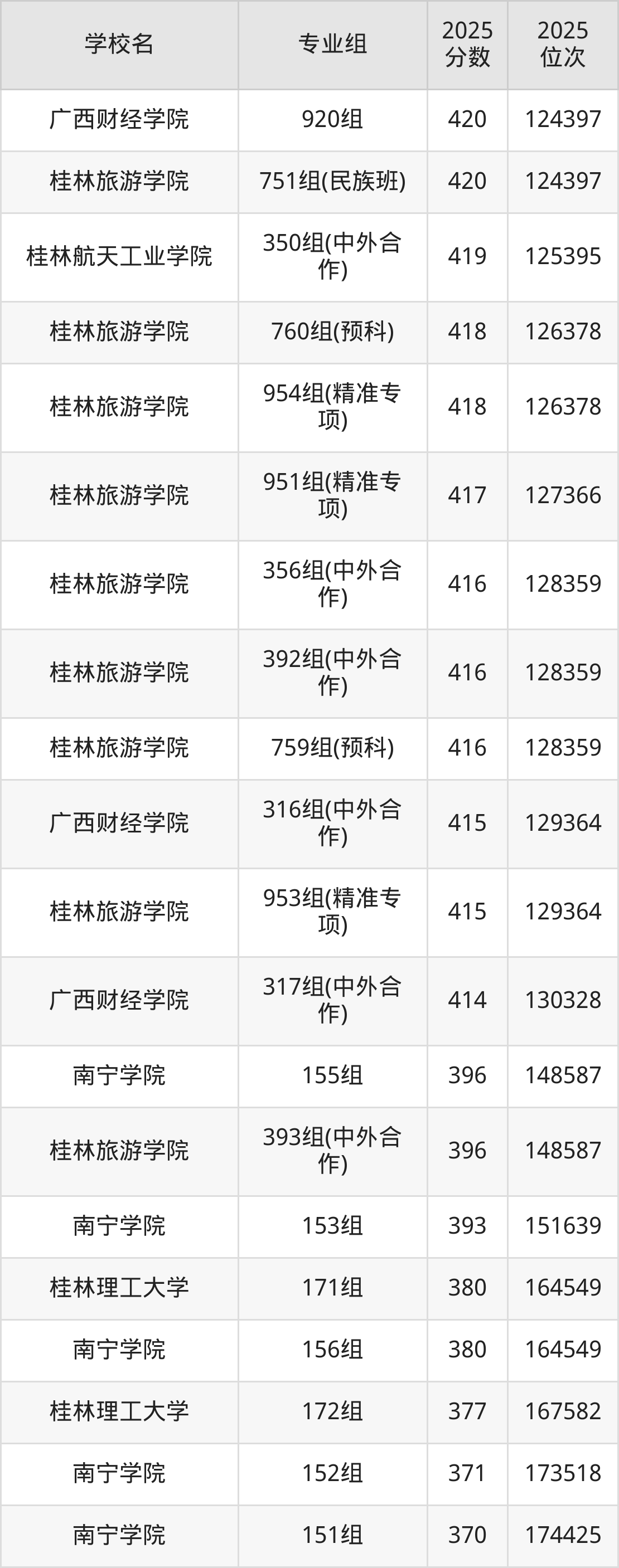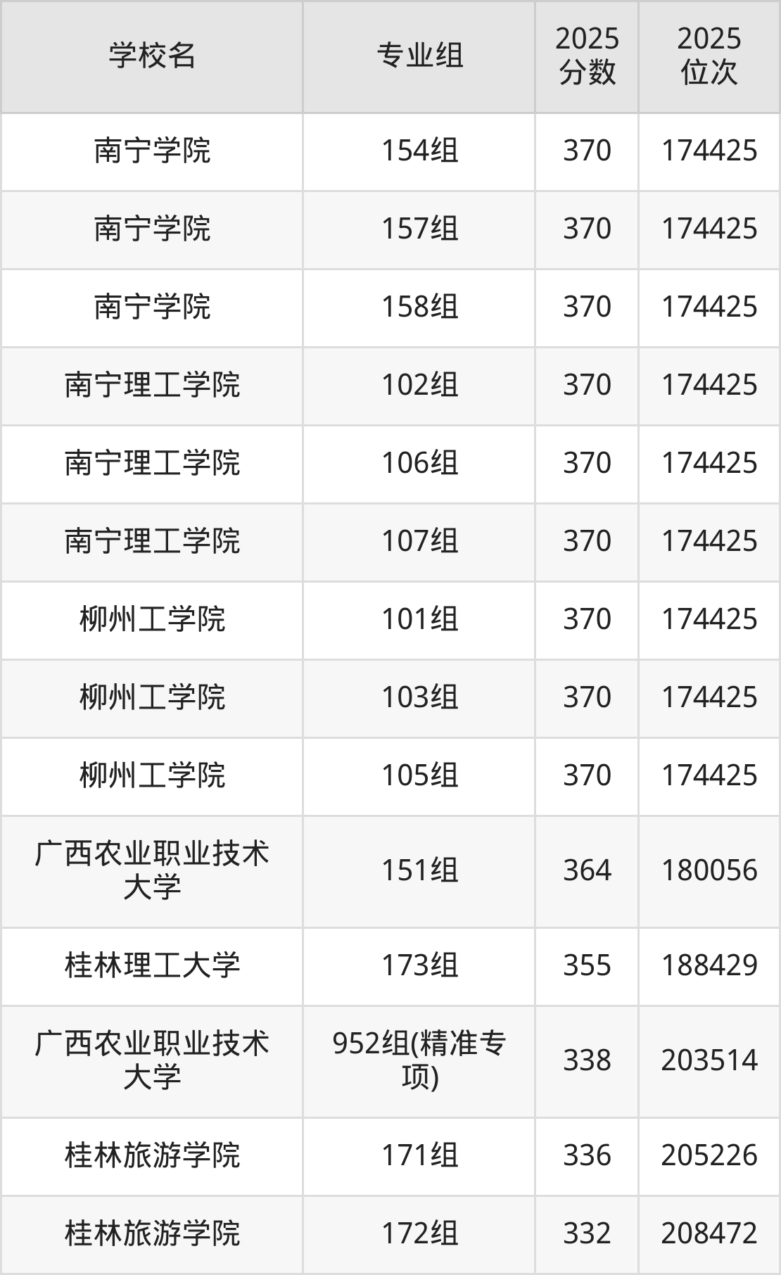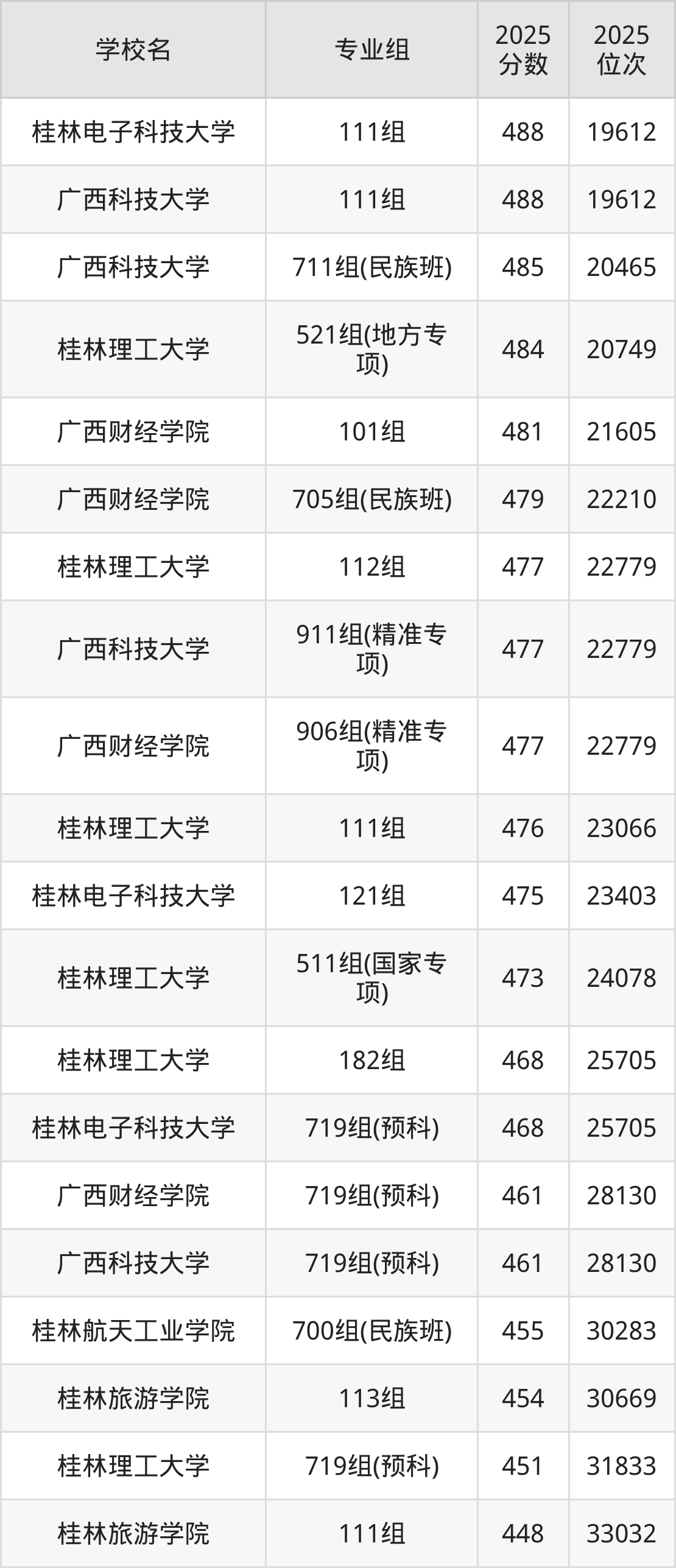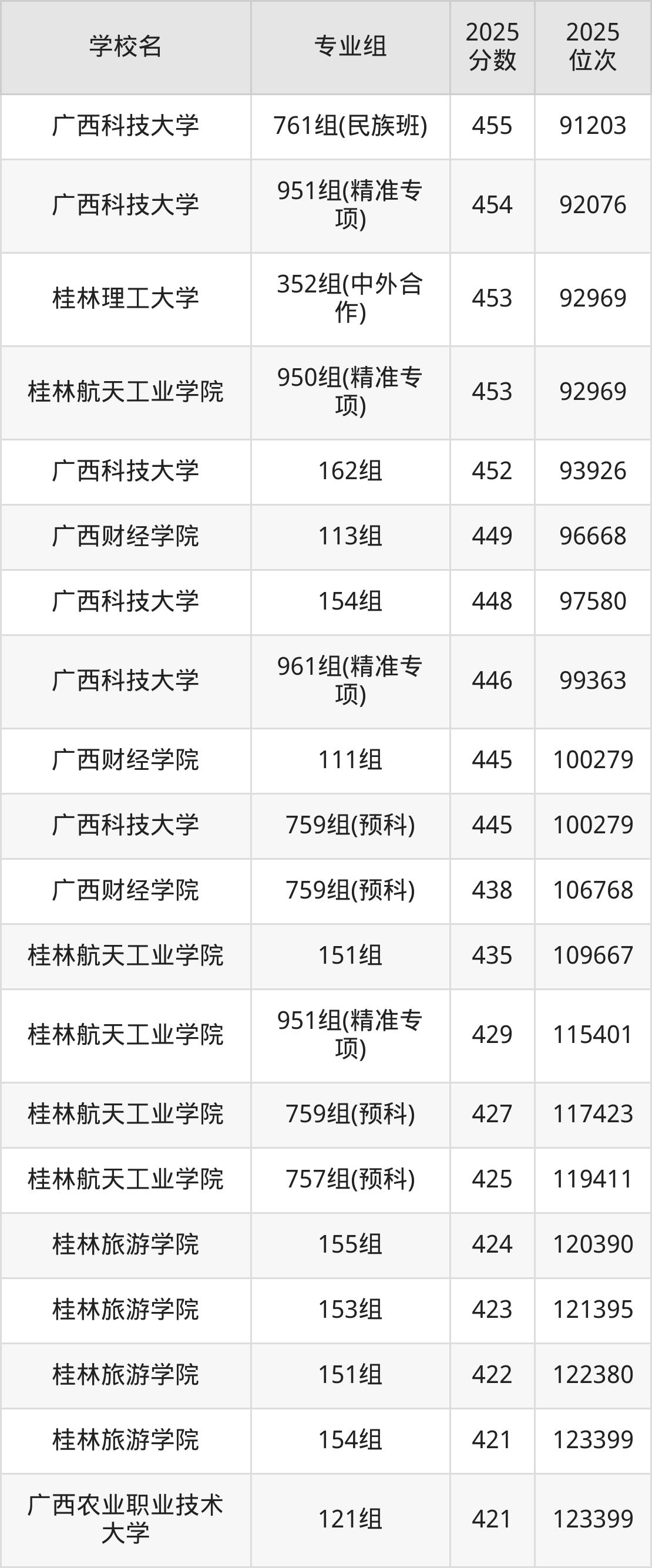 广西壮族自治区所有理科院校2025年录取分数线一览表(前94院校专业组):