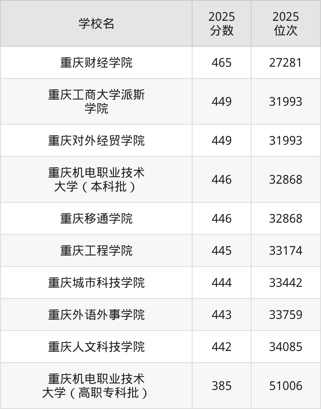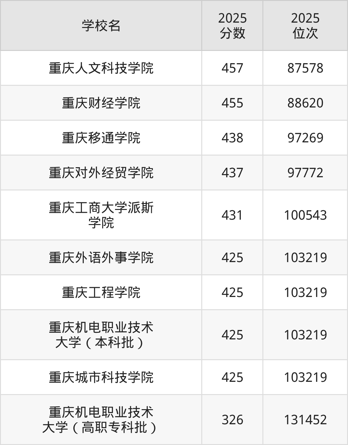 重庆排名靠前的民办本科院校有重庆人文科技学院、重庆财经学院、重庆对外经贸学院、重庆城市科技学院、重庆移通学院等。2025年重庆民办本科院校最低分:物理类326分、历史类385分,各校分数线具体如下。