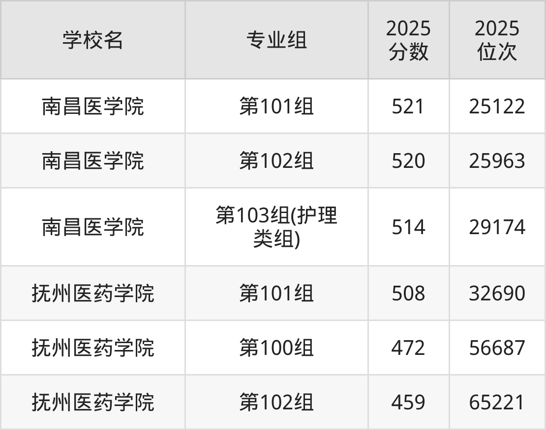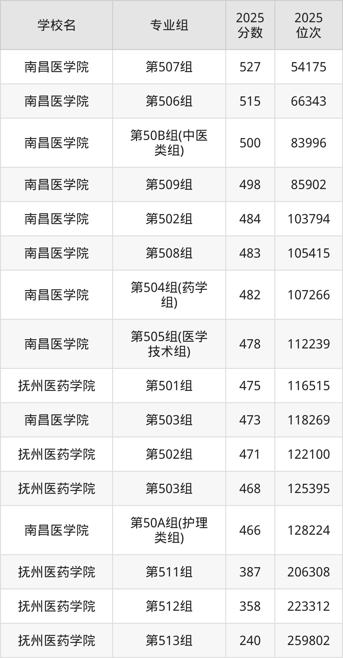 江西省所有二本医科院校2025年录取分数线一览表(前16院校专业组):