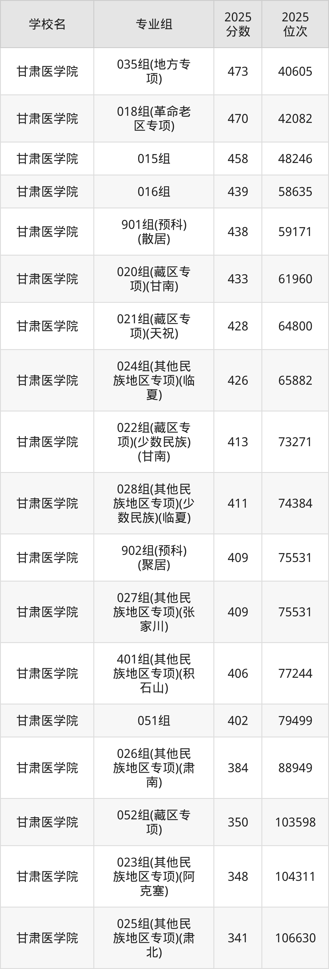 甘肃省所有二本医科院校2025年录取分数线一览表(前18院校专业组):