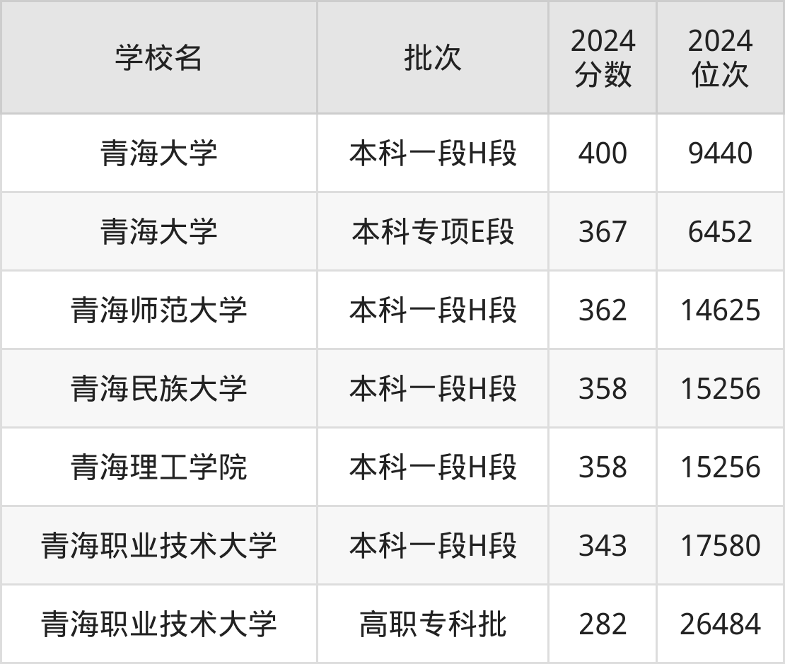 青海省所有公办本科院校2024年录取分数线一览表(前7院校):
