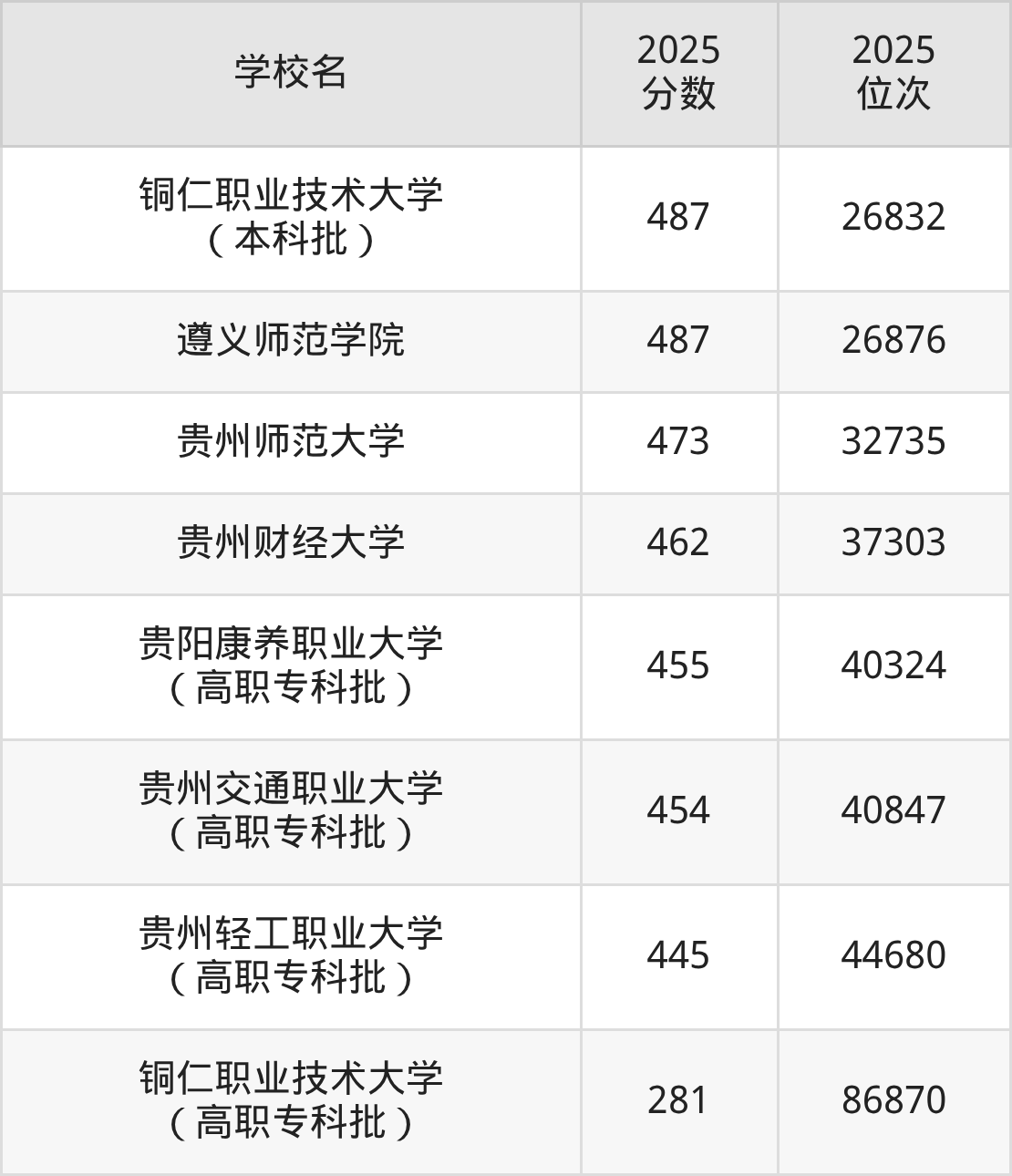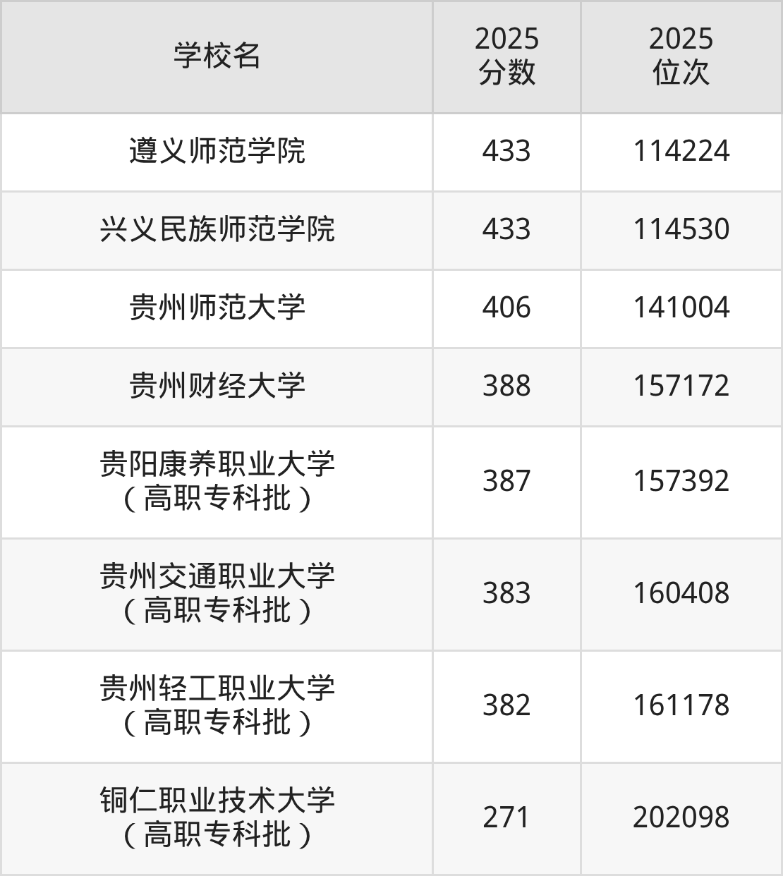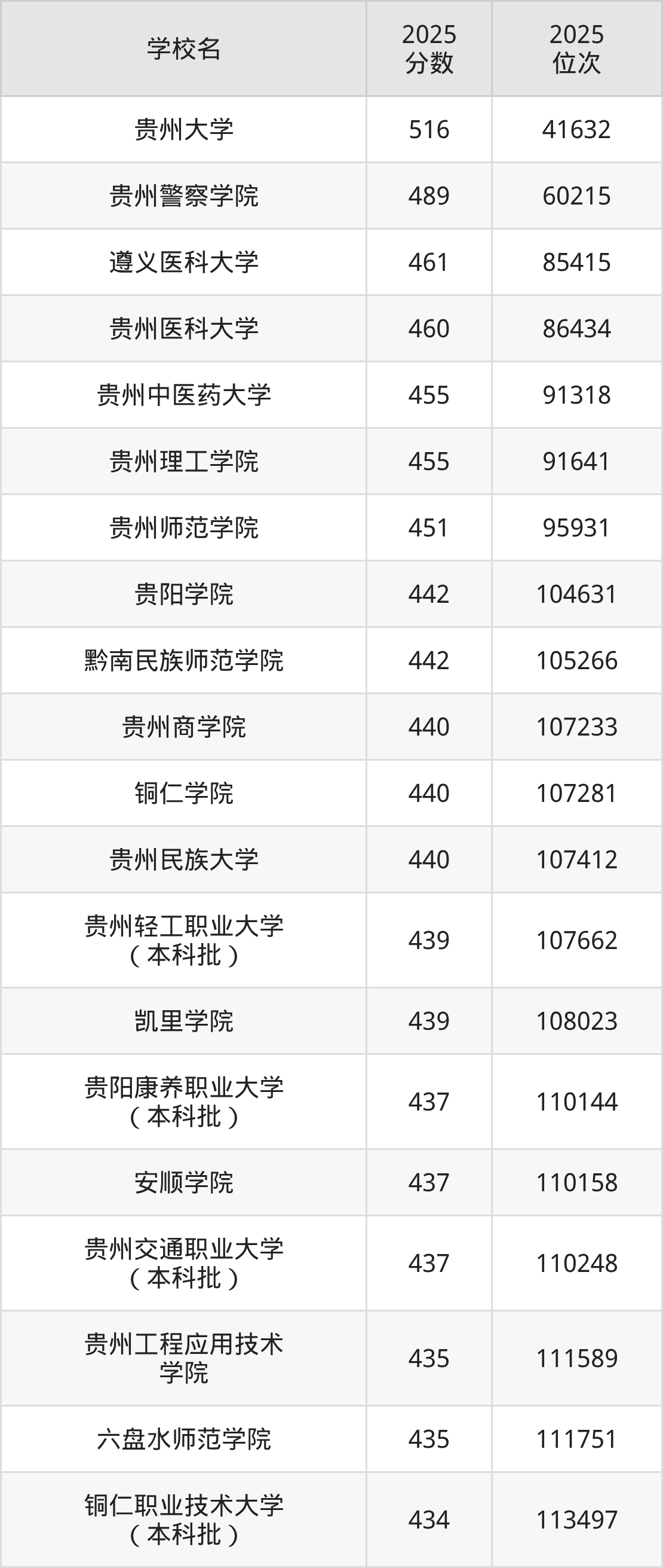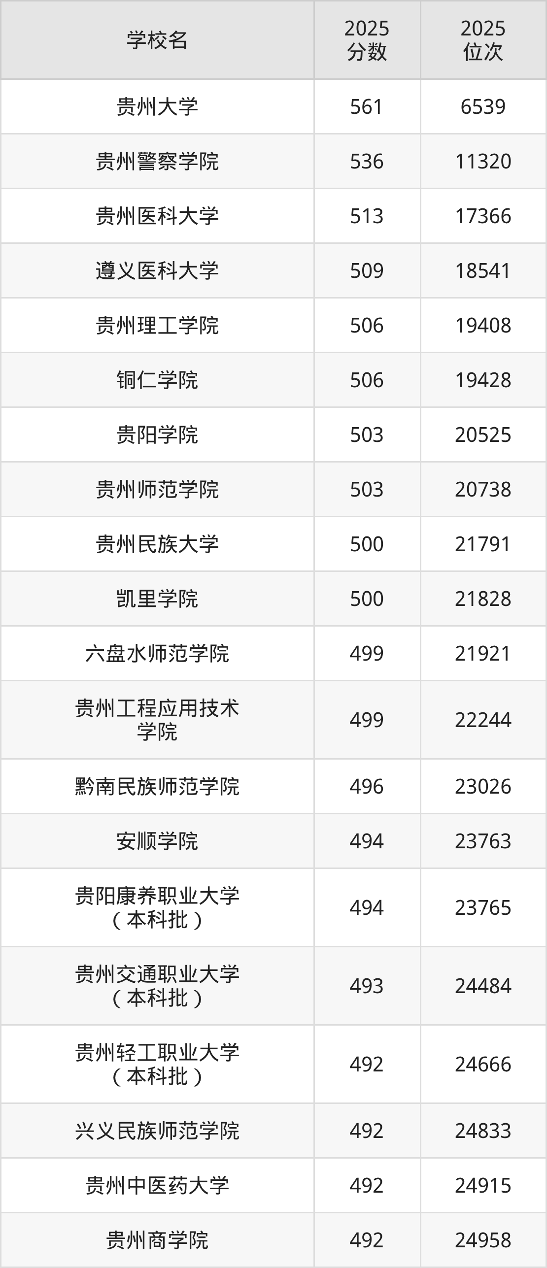 贵州省所有公办本科院校2025年录取分数线一览表: