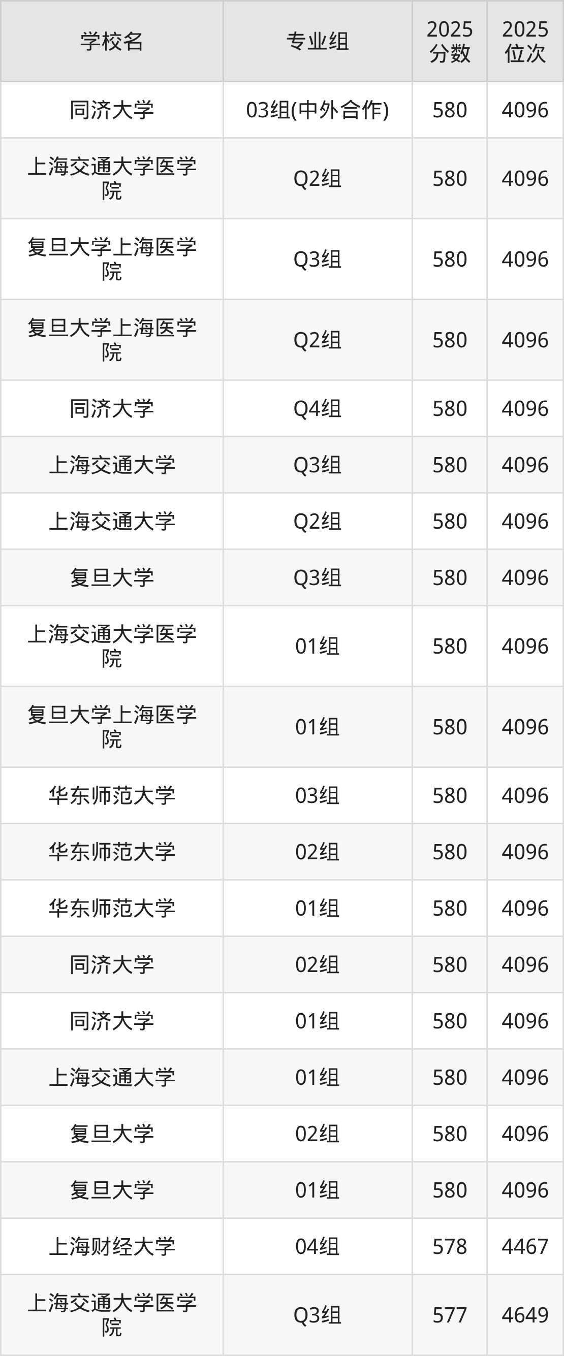 最难考、收分最高的是:同济大学,2025年学校的03组(中外合作)最低分580分,对应排位4096名。