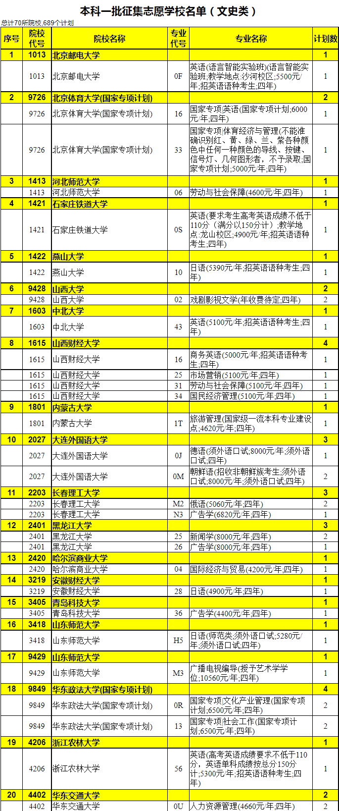 本科一批征集志愿学校名单(文史类)(可点击查看)