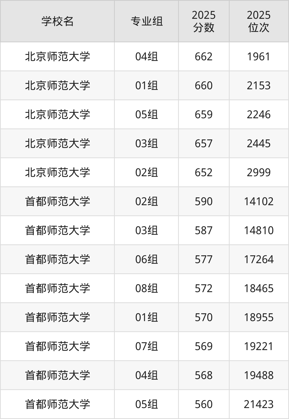 北京市所有师范类院校2025年录取分数线一览表(前13院校专业组):