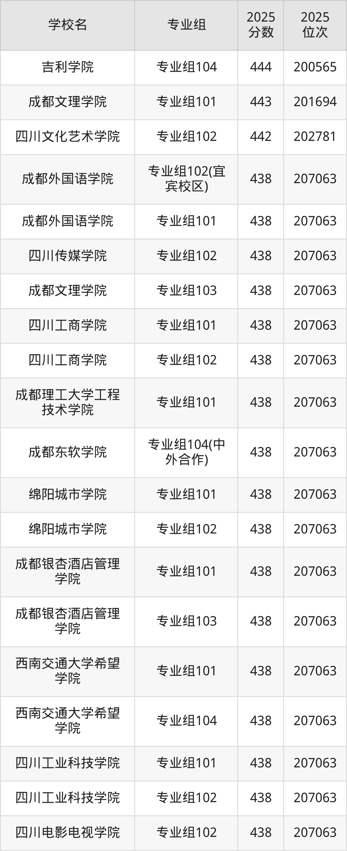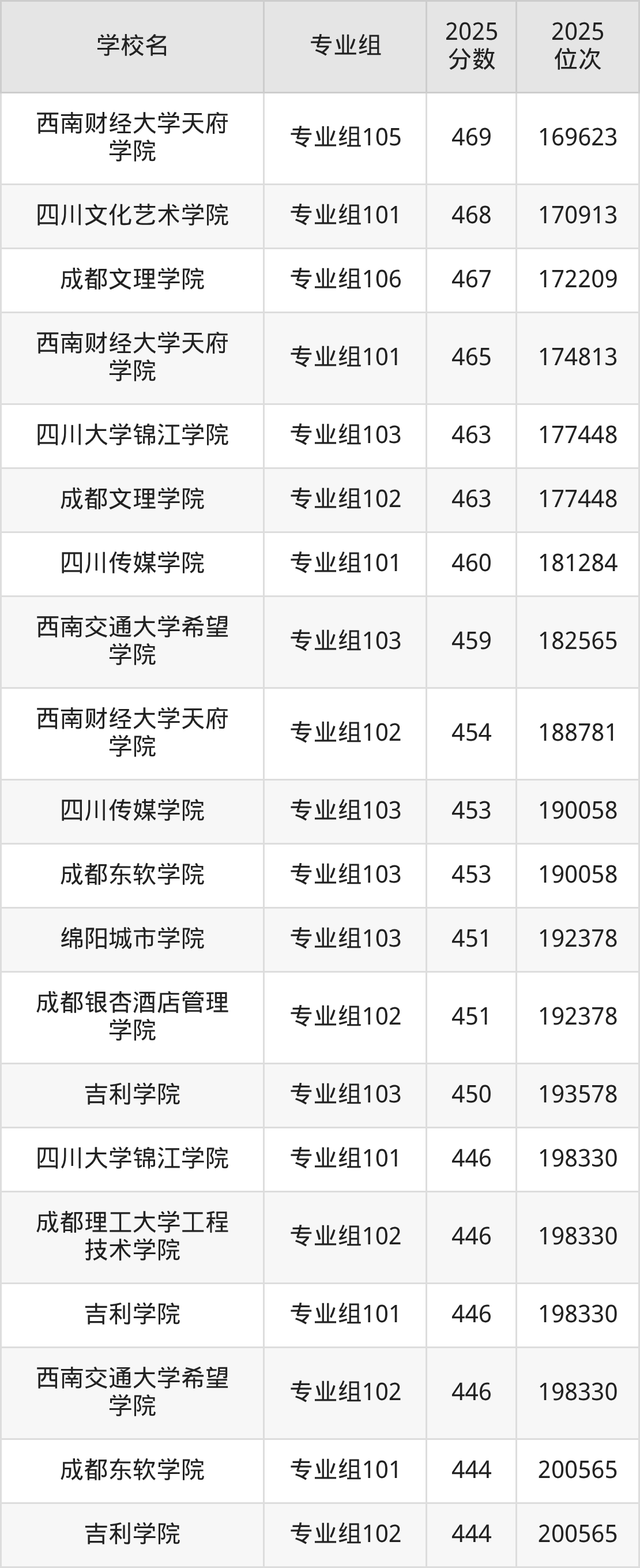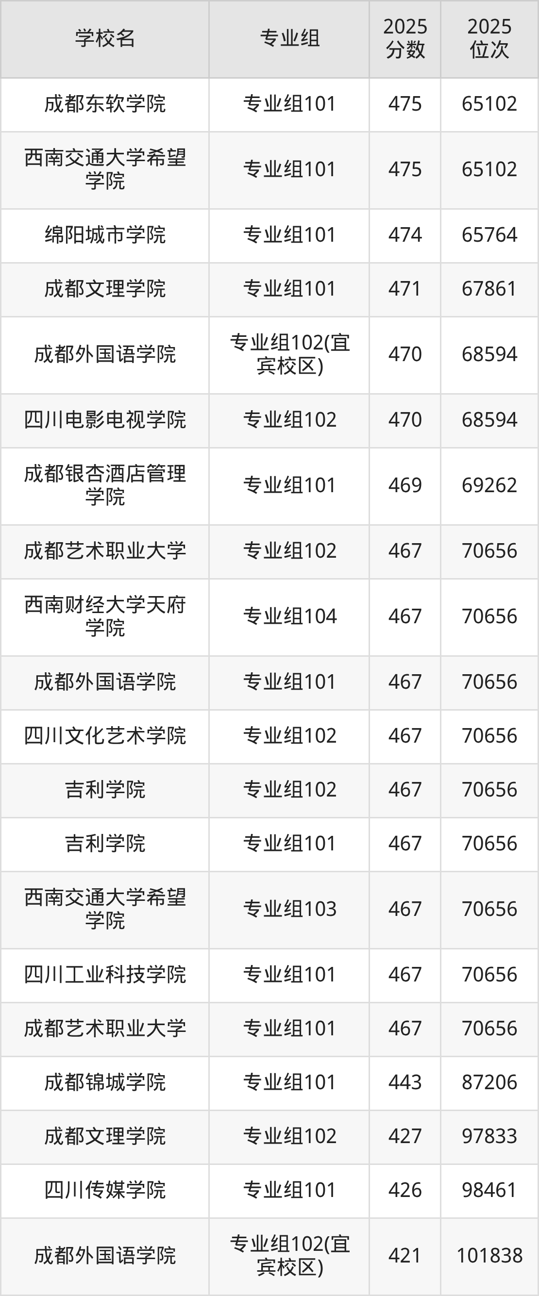 四川省所有民办本科院校2025年录取分数线一览表: