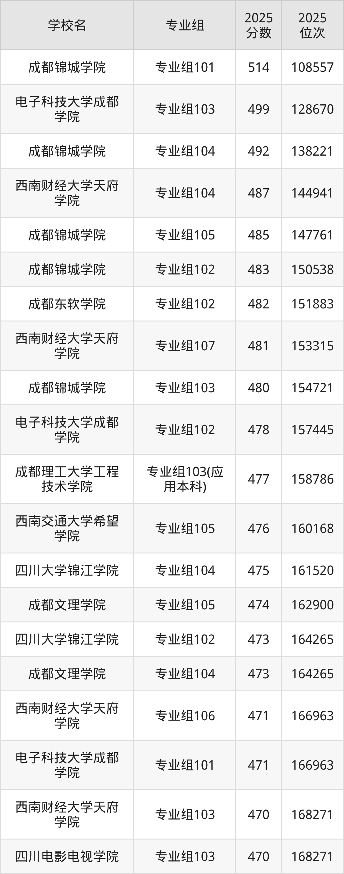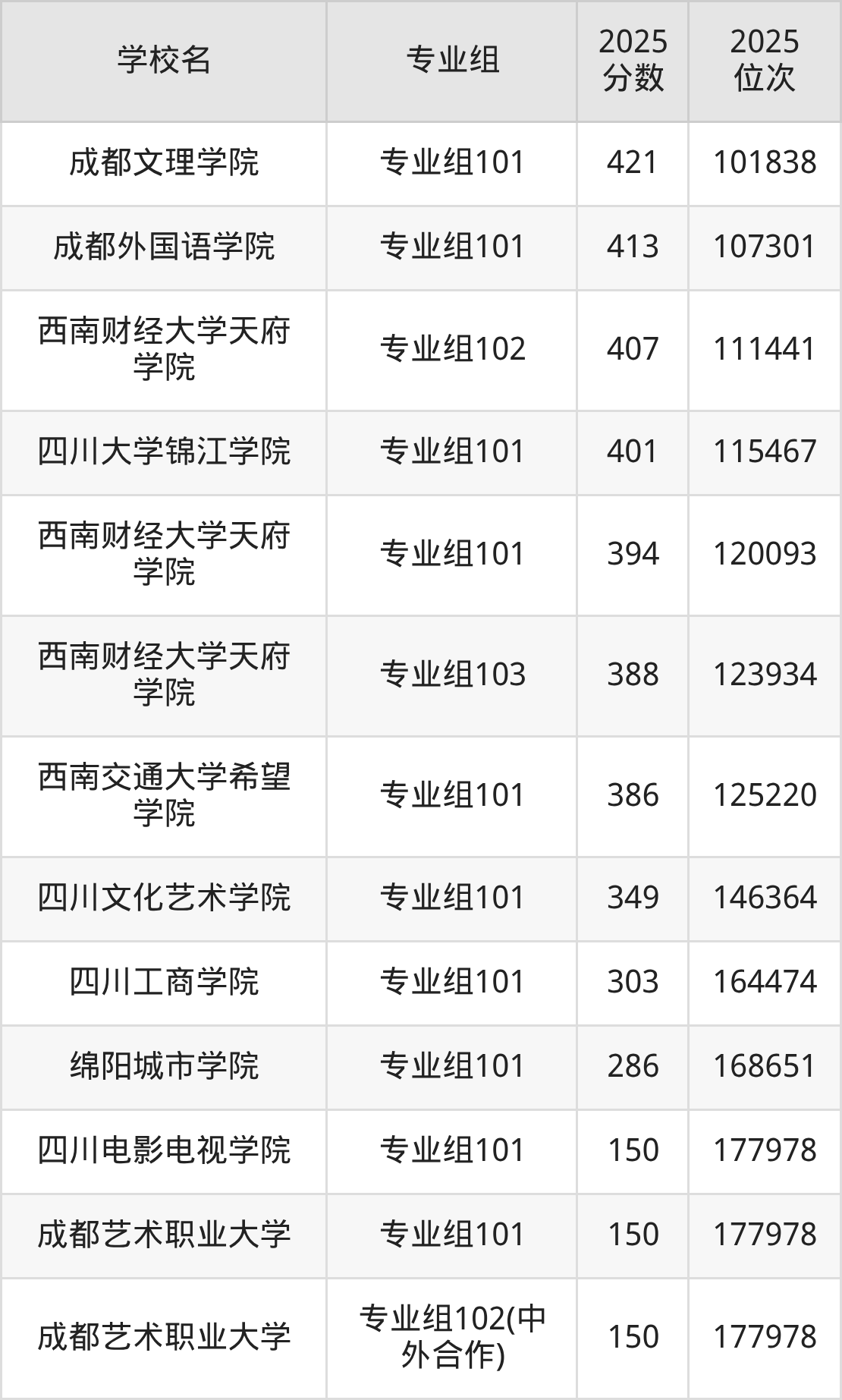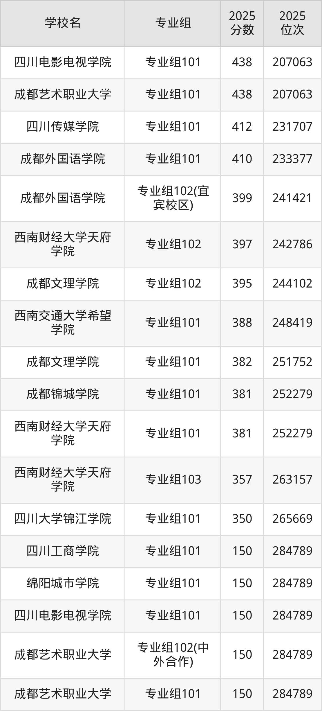 四川省所有民办本科院校2025年录取分数线一览表: