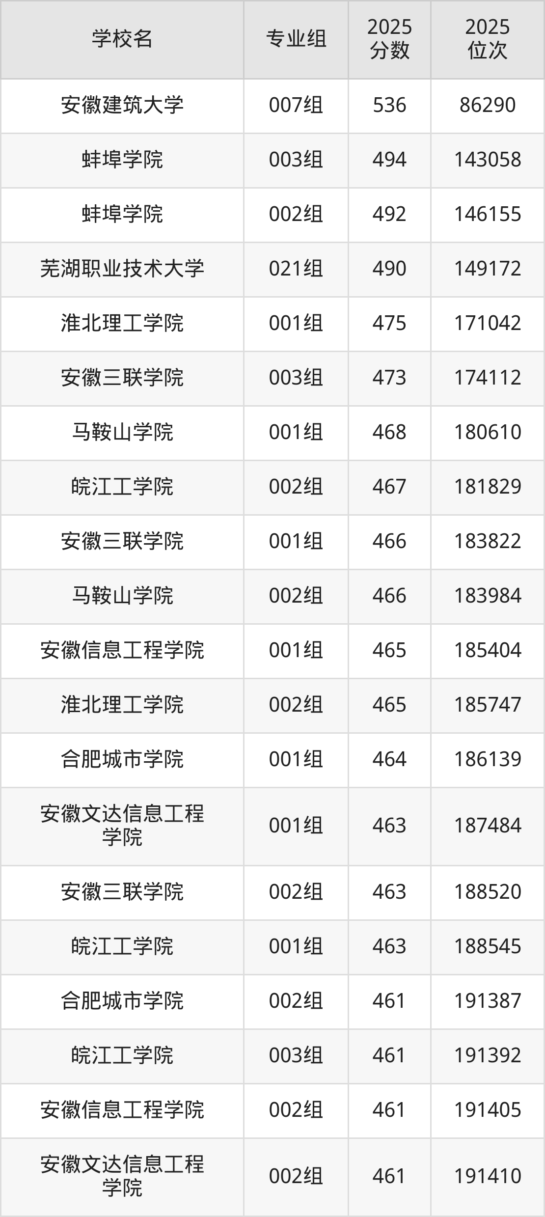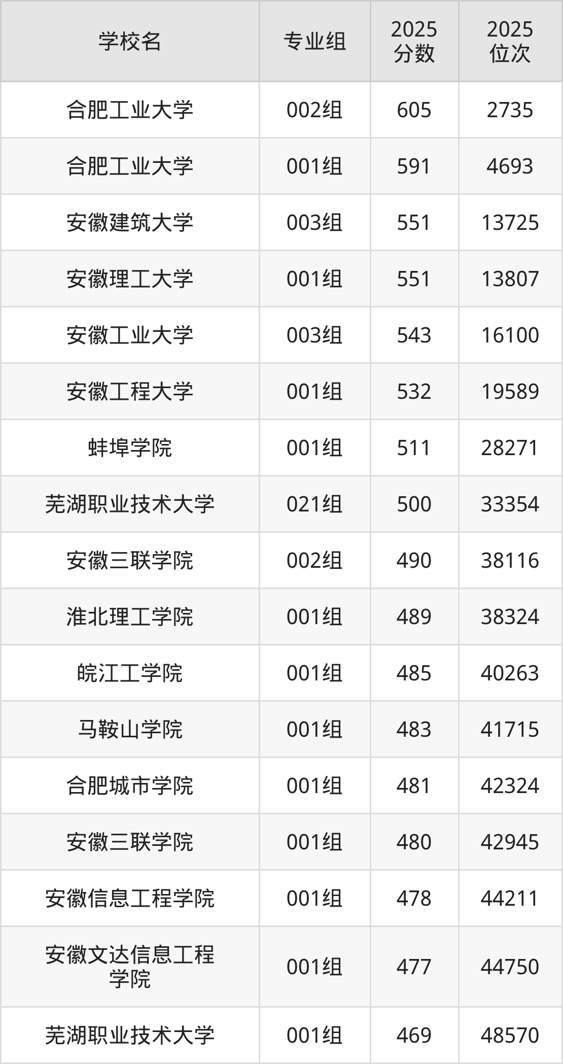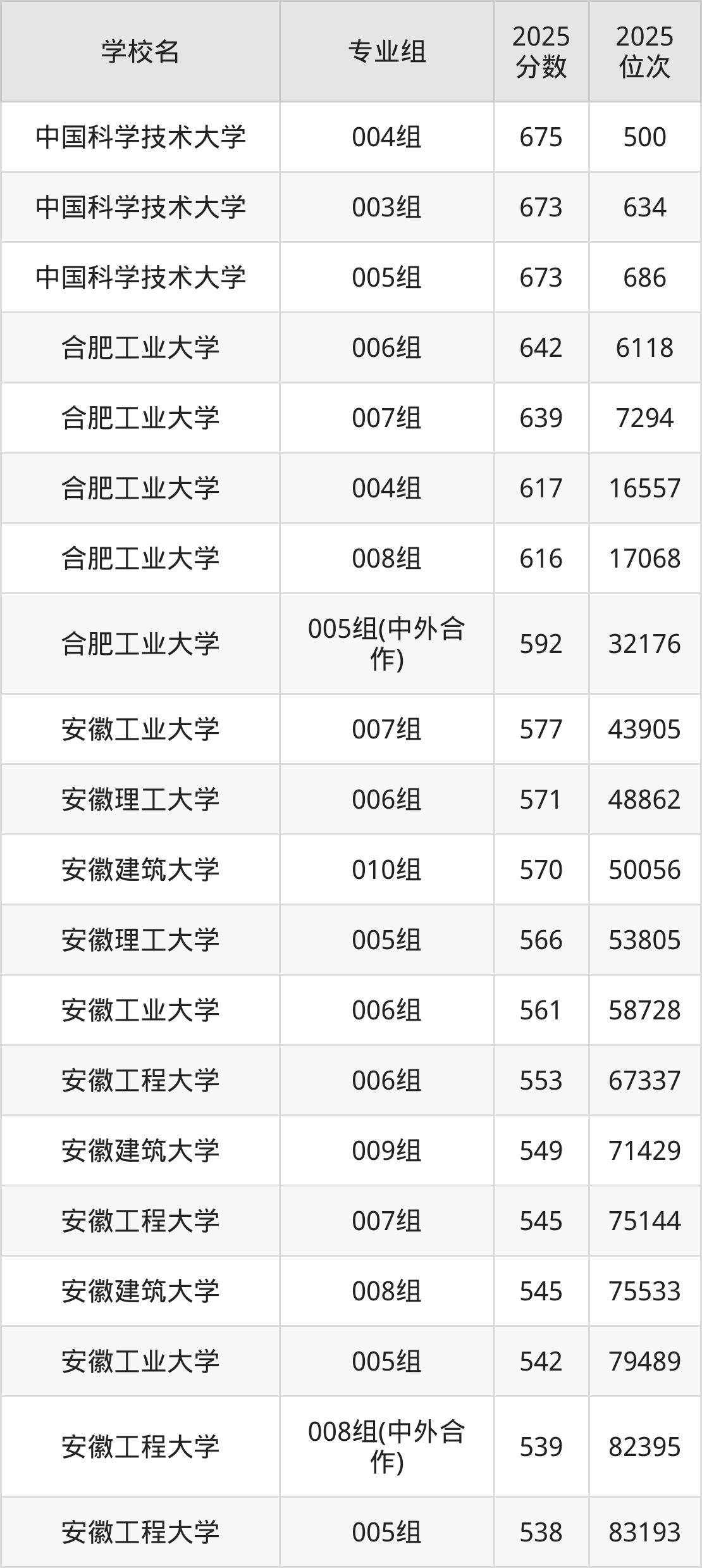 安徽省所有理工类院校2025年录取分数线一览表(前42院校专业组):