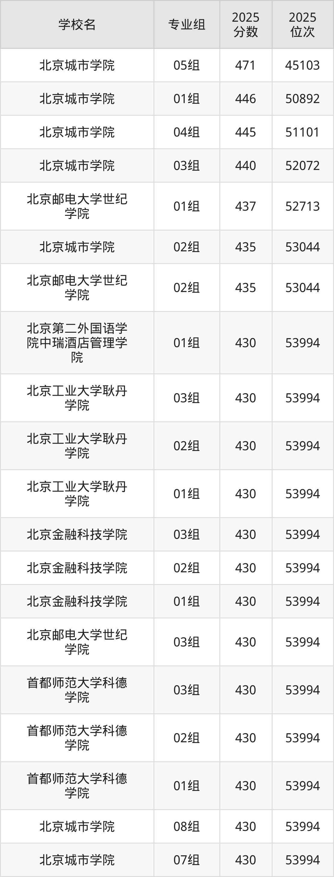 最难考、收分最高的是:北京城市学院,2025年学校的05组最低分471分,对应排位45103名。