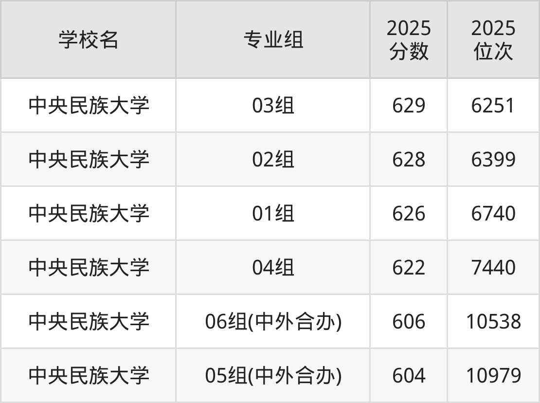 北京市所有民族类院校2025年录取分数线一览表(前6院校专业组):