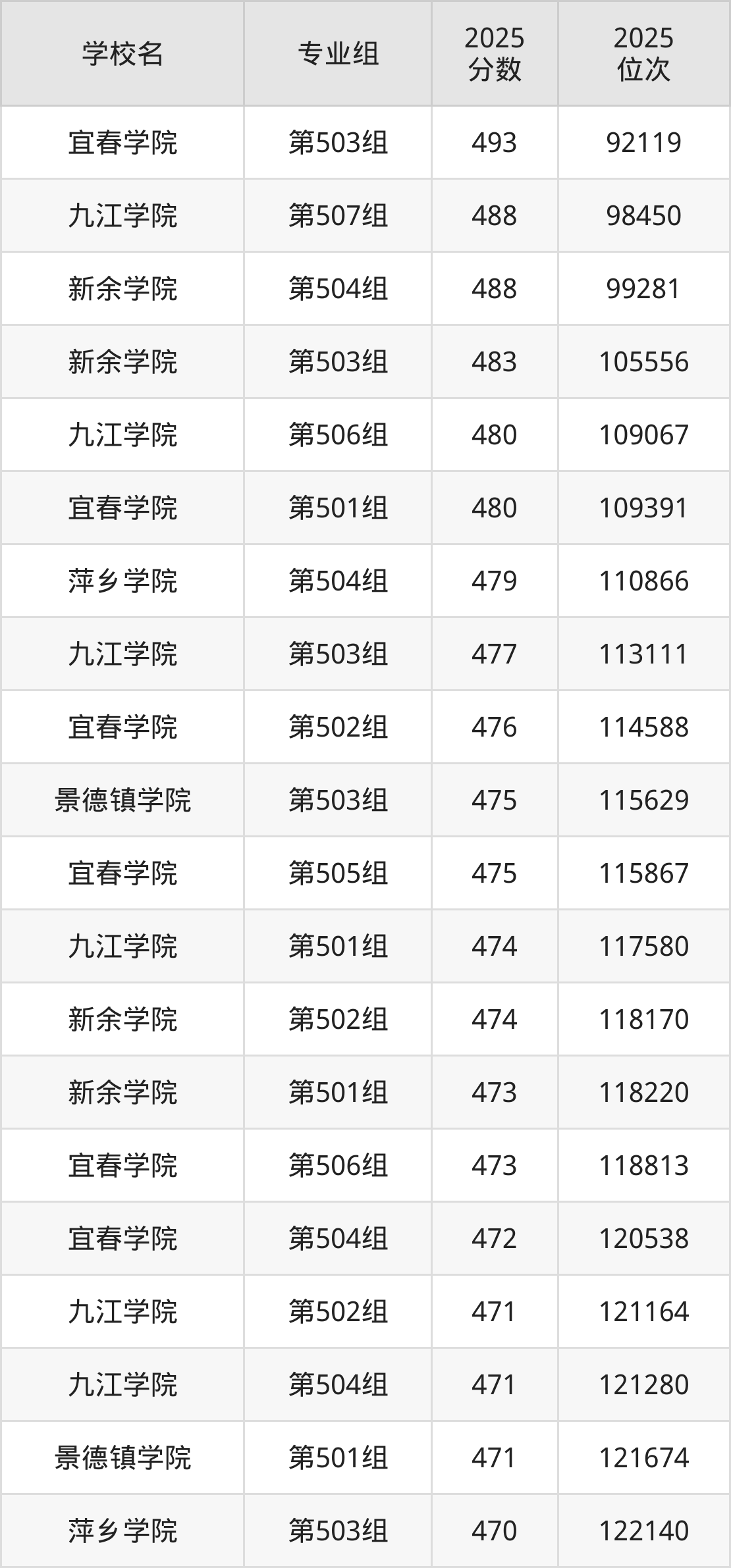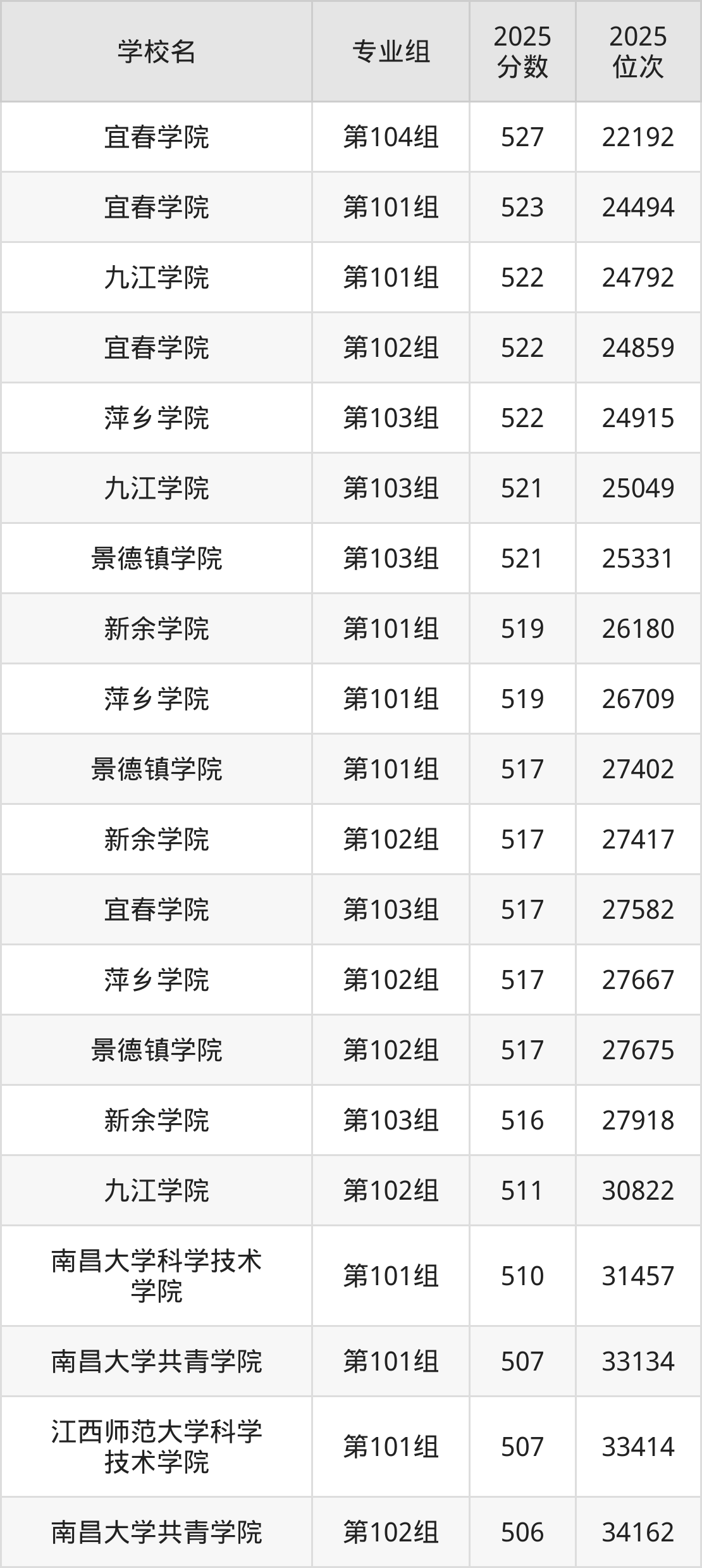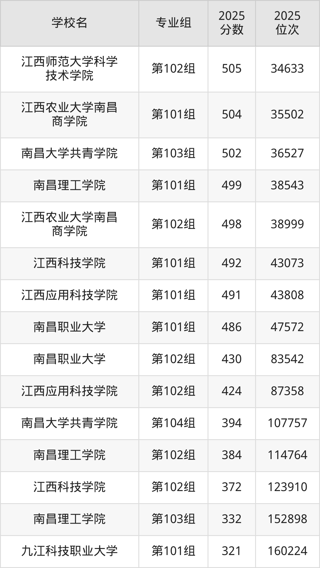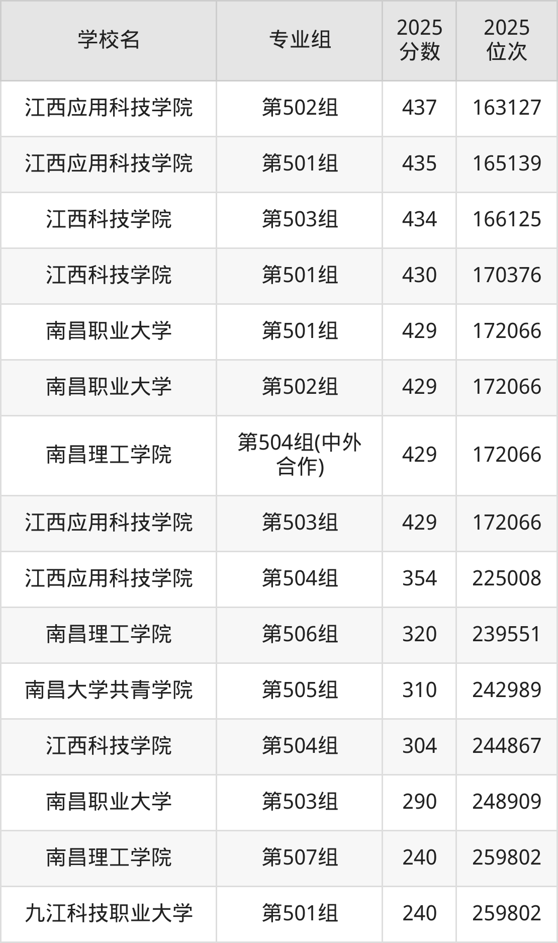 物理类最好考、收分最低的是:南昌理工学院,2025年第507组最低分240分,最低排名259802名;历史类最好考、收分最低的是:九江科技职业大学,2025年第101组最低分321分,最低排名160224名。