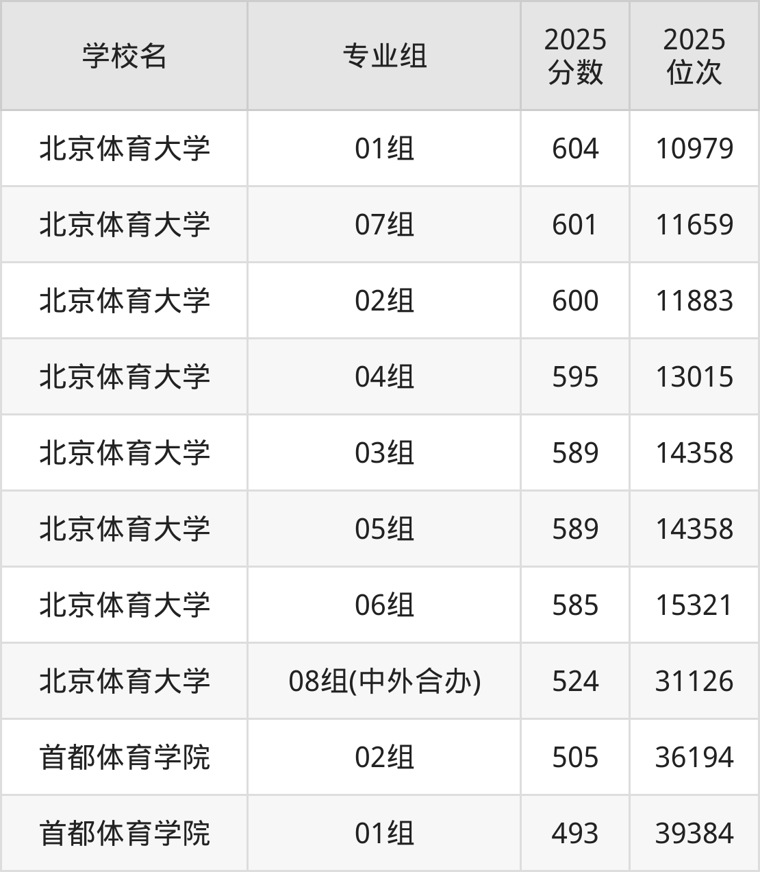 北京市所有体育类院校2025年录取分数线一览表(前10院校专业组):
