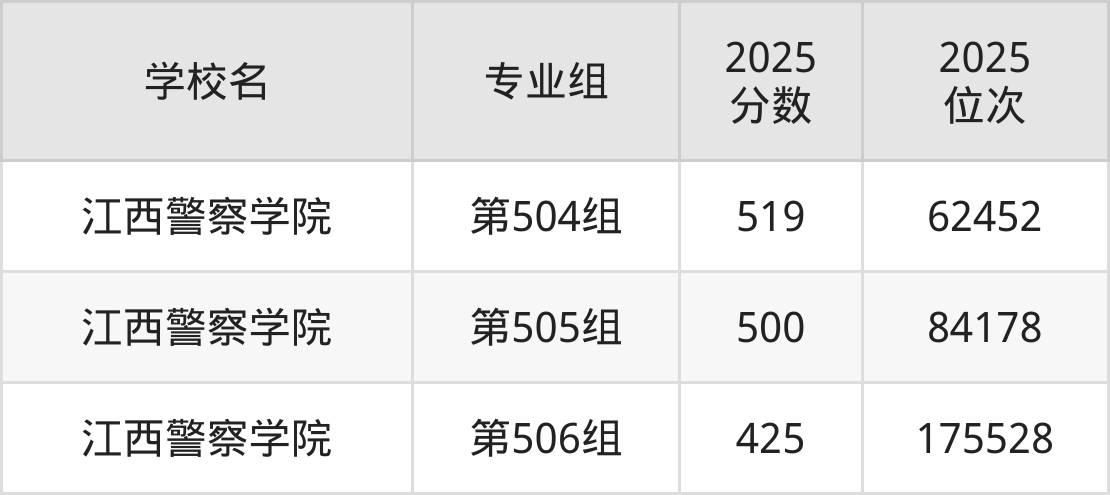 物理类最好考、收分最低的是:江西警察学院,2025年第506组最低分425分,最低排名175528名;历史类最好考、收分最低的是:江西警察学院,2025年第104组最低分496分,最低排名40550名。
