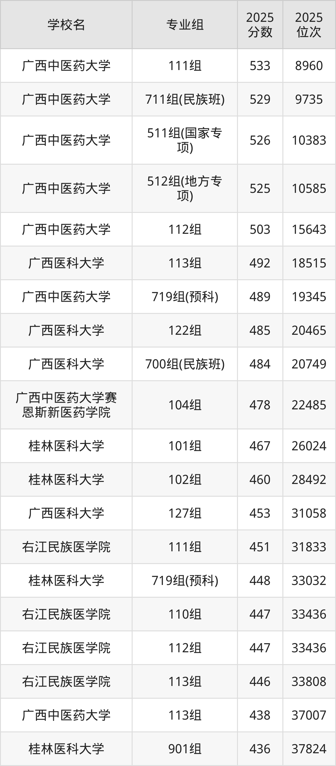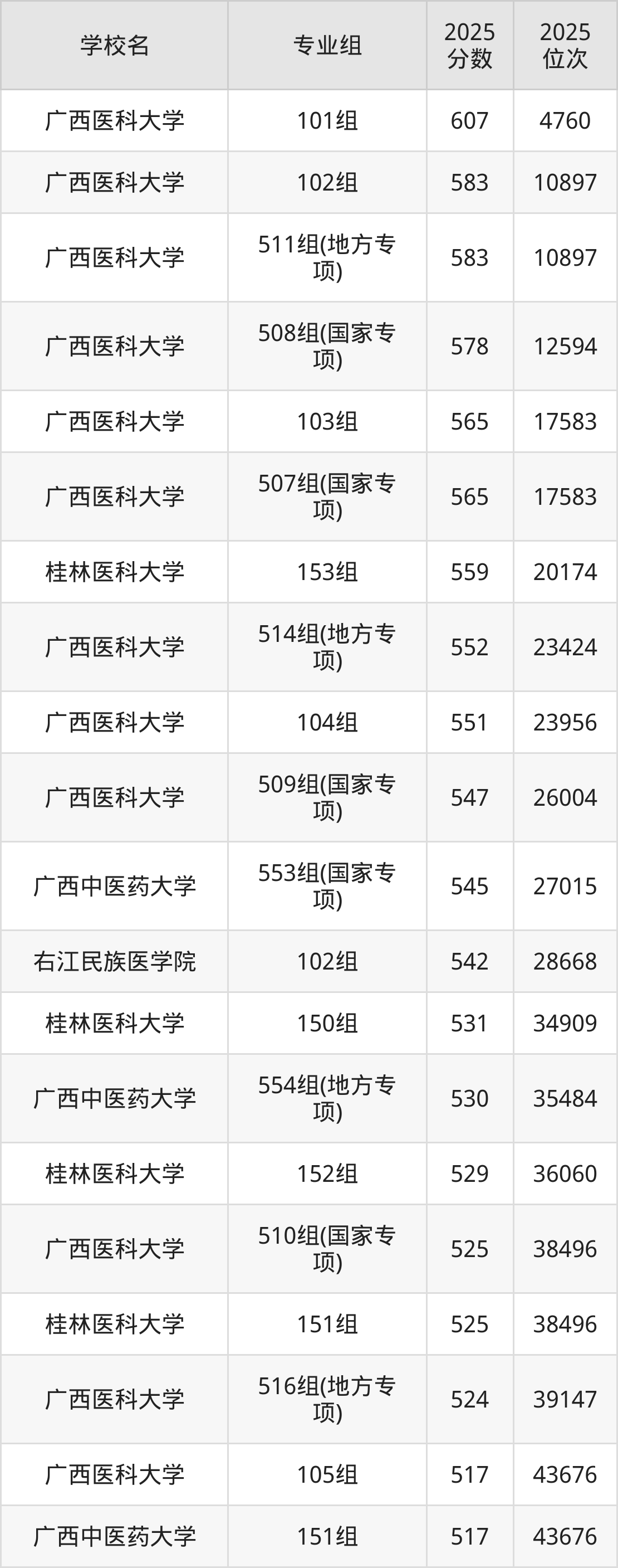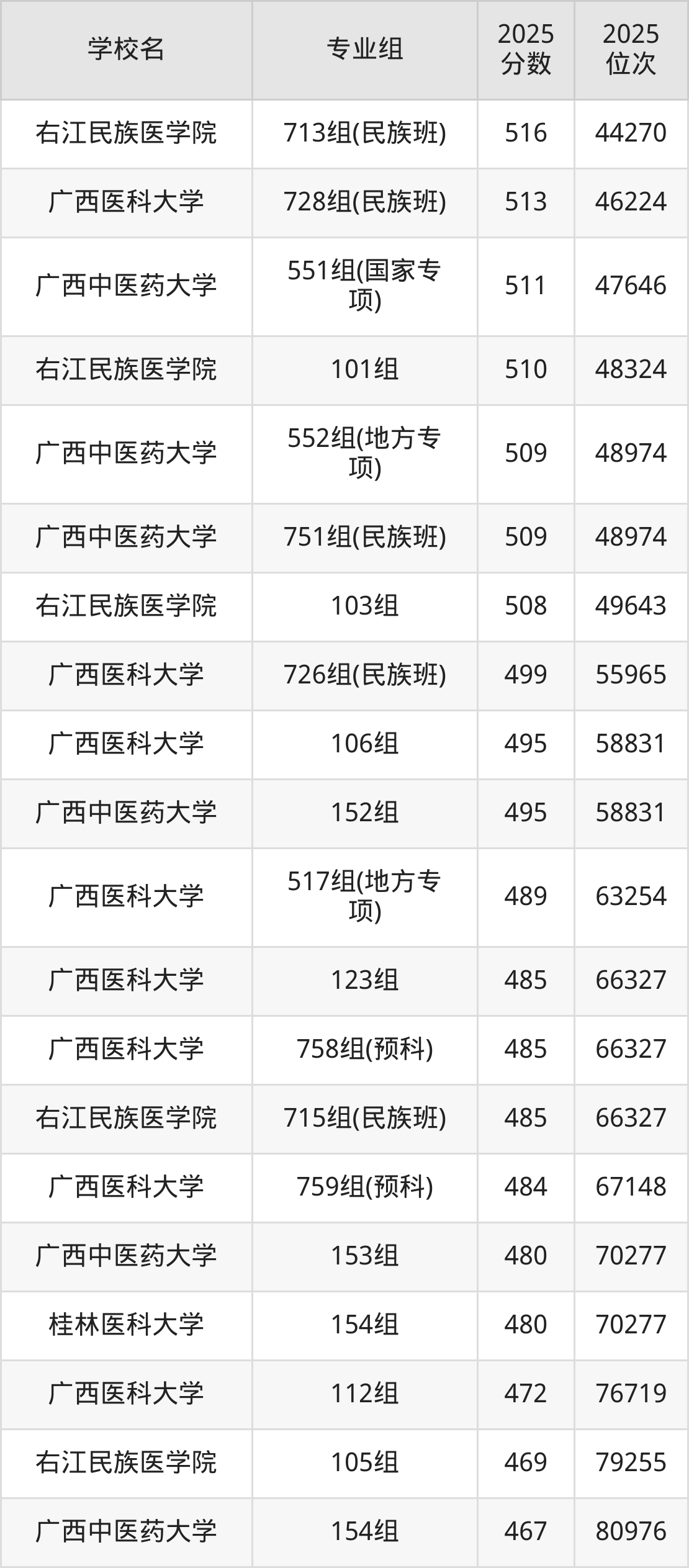 广西壮族自治区所有医科院校2025年录取分数线一览表(前80院校专业组):