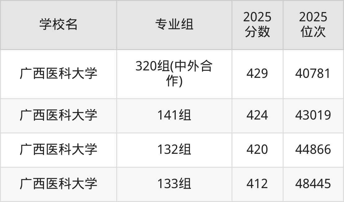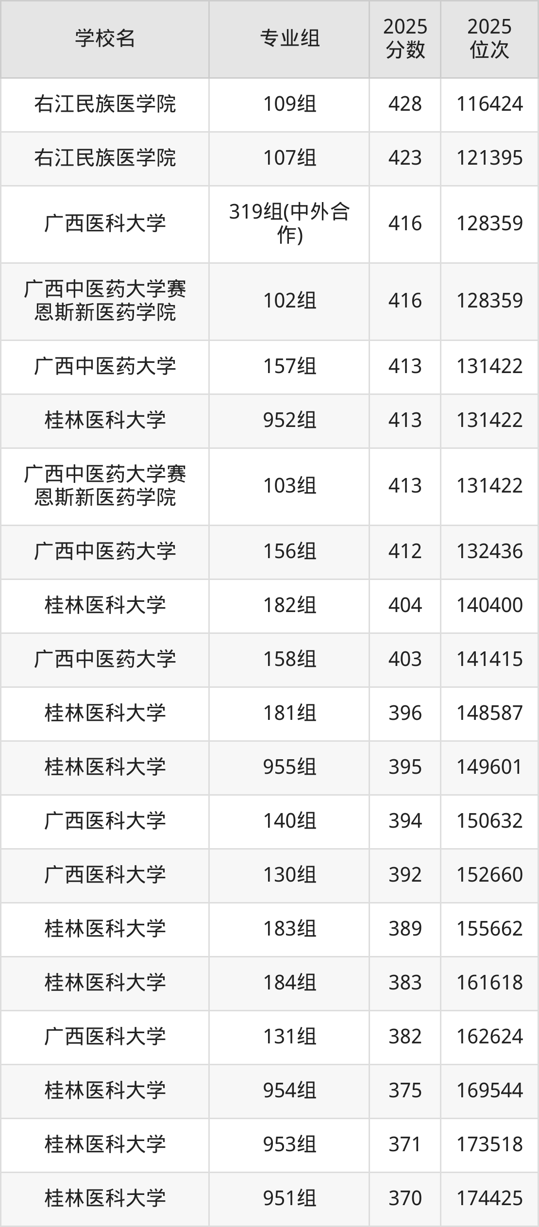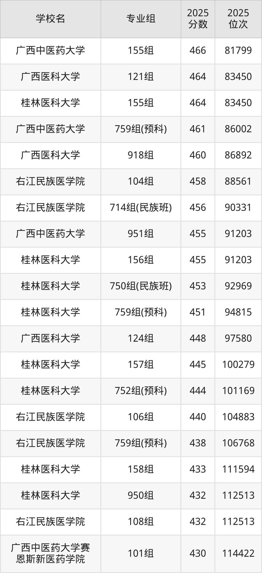 广西壮族自治区所有医科院校2025年录取分数线一览表(前80院校专业组):
