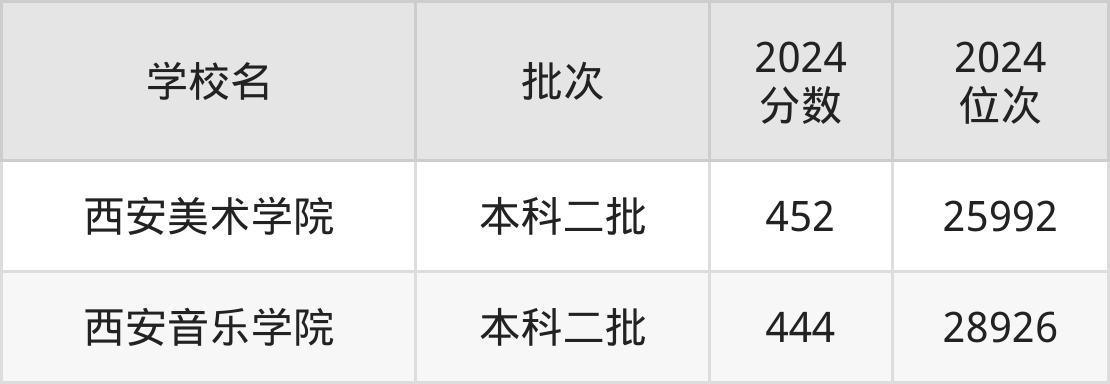 理科最好考、收分最低的是:西安美术学院,2024年最低分433分,最低排名90597名;文科最好考、收分最低的是:西安音乐学院,2024年最低分444分,最低排名28926名。