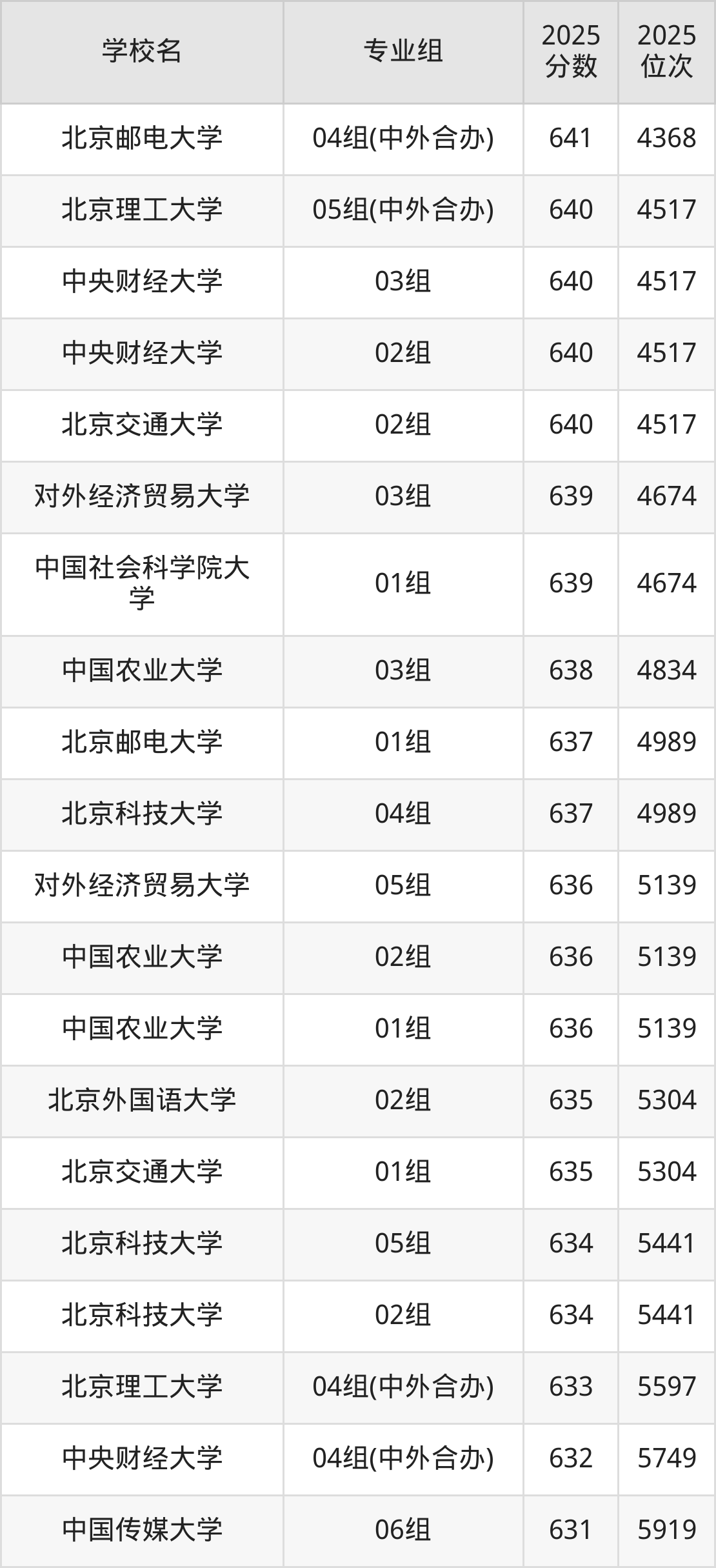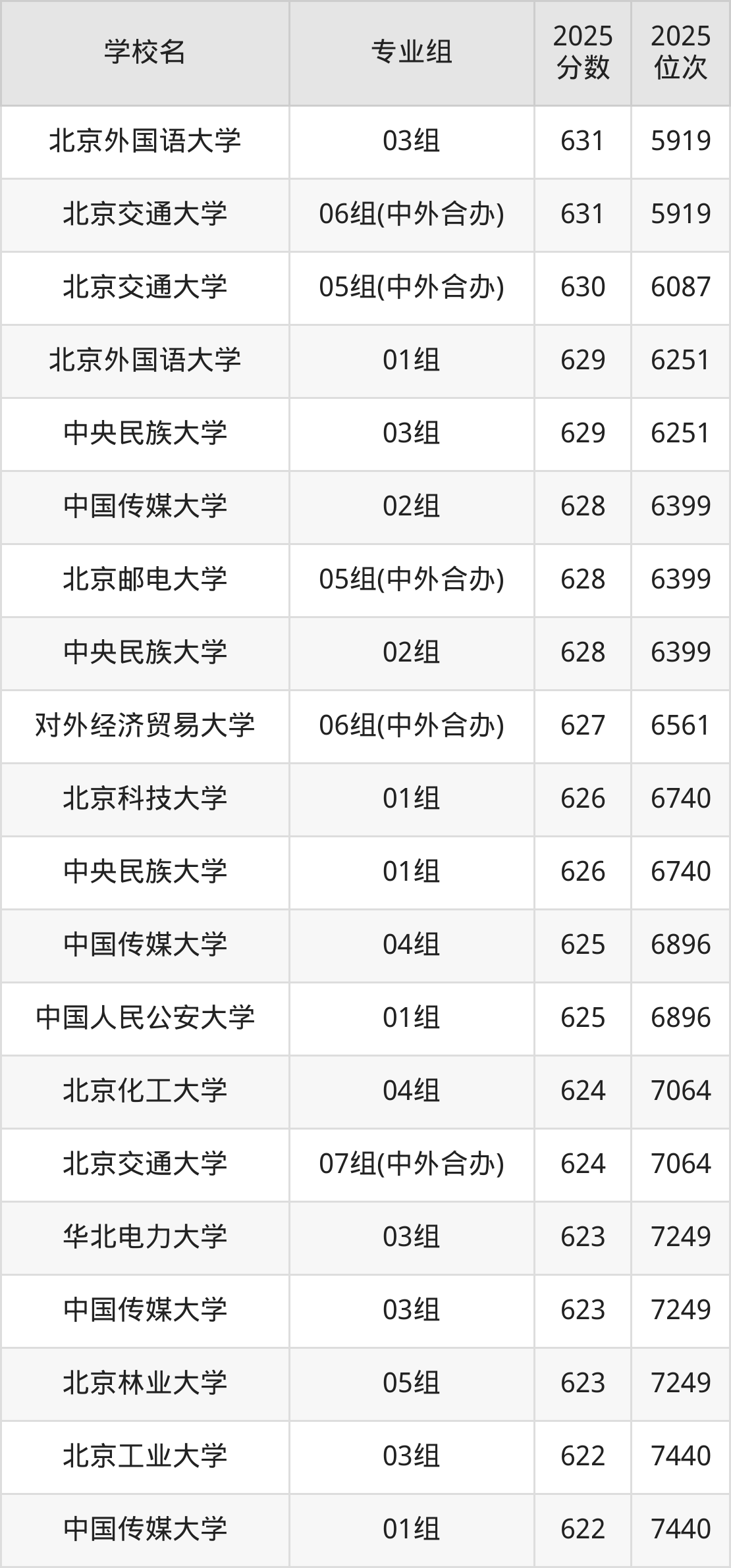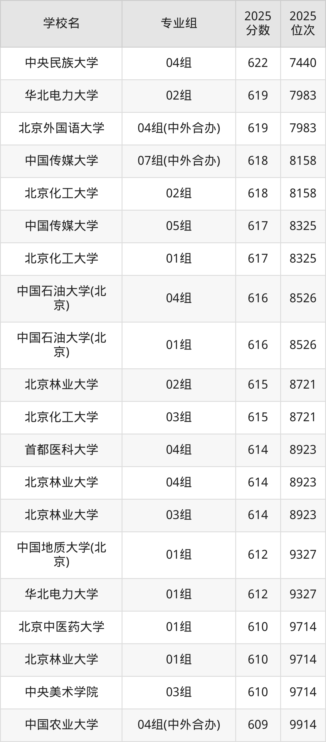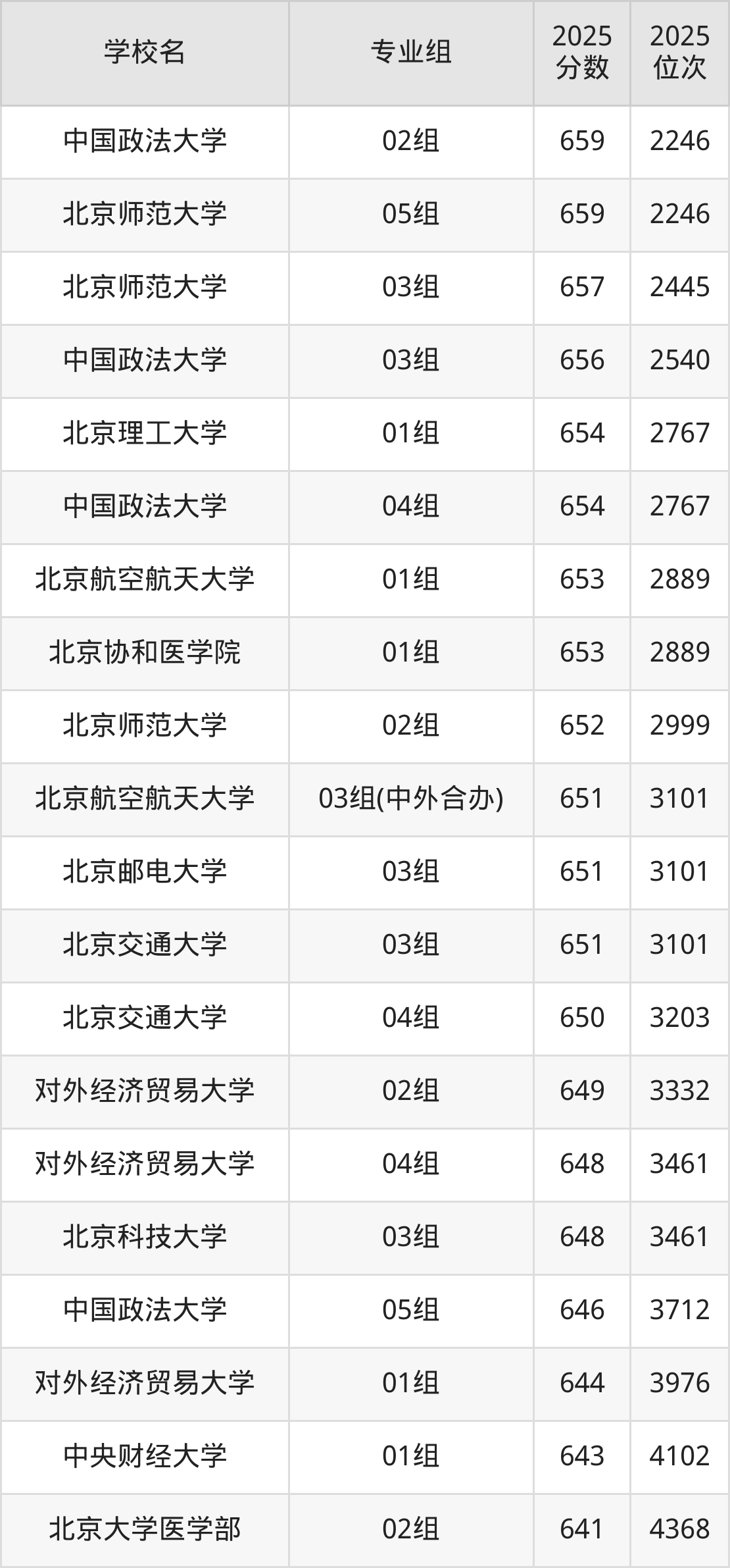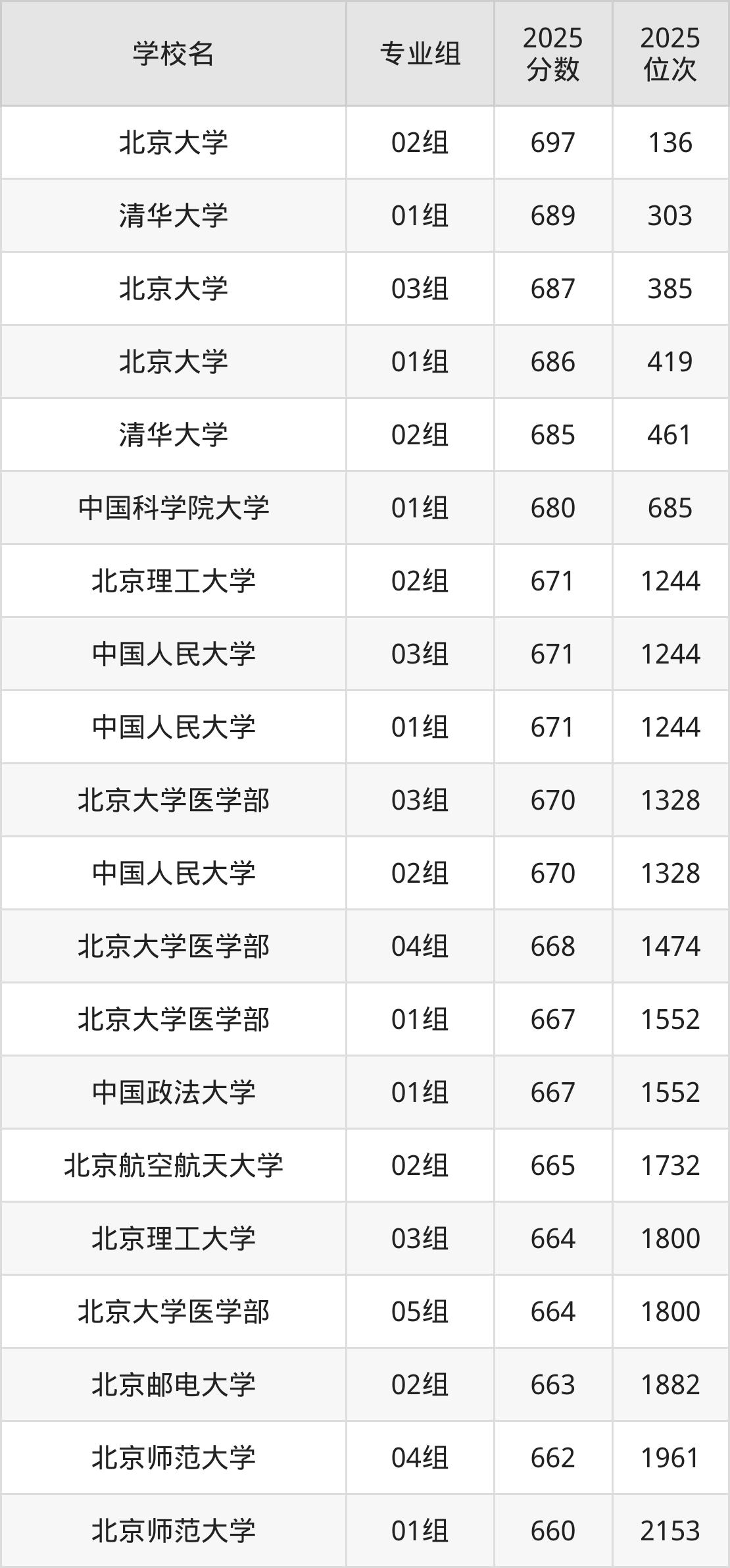 北京市所有公办本科院校2025年录取分数线一览表(前100院校专业组):