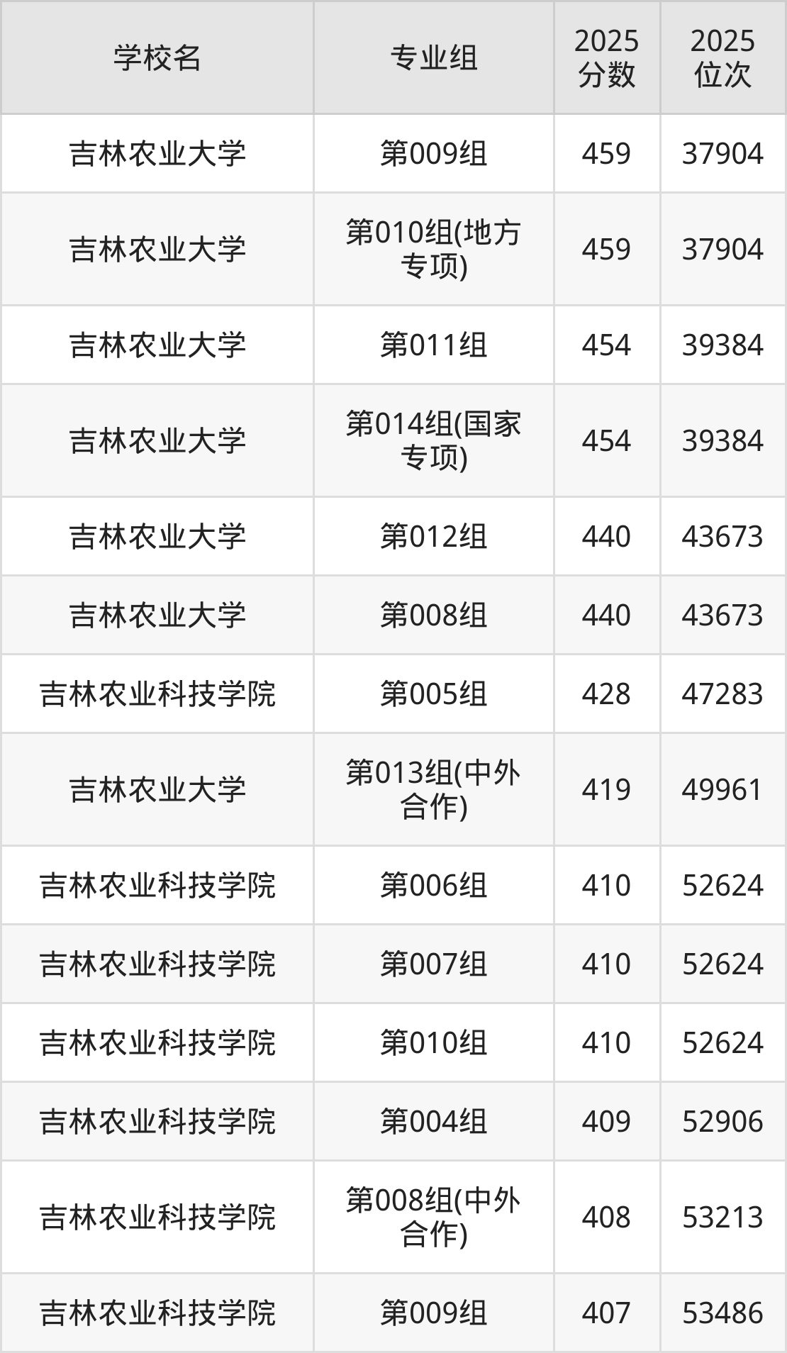 吉林省所有农林类院校2025年录取分数线一览表(前14院校专业组):